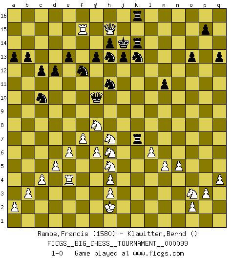 Last move : 1-0 2015 July 3 2:38:14 [Event "FICGS__BIG_CHESS__TOURNAMENT__000099"] [Site "FICGS"] [Date "2015.04.12"] [Round "1"] [White "Ramos,Francis"] [Black "Klawitter,Bernd"] [Result "1-0"] [WhiteElo "1580"] [BlackElo ""] 1.e2-e4 m15-m13 2.j2-h4 p16-o14 3.b2-b3 l16-o13 4.c1-b2 g15-g13 5.c2-c4 h16-a9 6.n2-n4 n15-n14 7.e4-e5 o16-g9 8.m2-m4 a9-d12 9.p1-o3 e15-e13 10.d2-d4 b15-b14 11.g2-g4 c16-b15 12.k1-l3 b16-a14 13.l1-n3 f16-a11 14.d4-d5 a11-h4 15.j3-h4 k16-l14 16.e5-e6 a14-b12 17.o1-k5 j15-h13 18.b1-d2 g16-f14 19.g1-f3 h15-j13 20.h2-j4 d12-f10 21.h1-l4 a15-a13 22.q1-n1 b12-c10 23.m4-m5 g9-n3 24.n1-n3 f10-f4 25.j4-g3 c15-c13 26.b2-e5 f4-f10 27.j1-h2 j13-h11 28.l3-j4 b15-e12 29.k2-k4 j16-j15 30.d2-e4 q15-q13 31.f3-g5 d15-d13 32.k5-d11 e12-d11 33.l4-d11 h13-f12 34.d11-k5 q16-q14 35.f2-f4 m13-m12 36.g3-h5 q14-p14 37.p2-p3 m16-m13 38.l2-l4 m13-k13 39.k5-j5 f14-h13 40.f1-g2 o13-p12 41.f4-f5 n14-n13 42.l4-l5 p12-n14 43.f5-f6 n14-m13 44.f6-f7 f10-g10 45.e4-f6 m13-n12 46.j5-n9 j14-j13 47.g2-e4 n12-e4 48.e1-e4 d13-d12 49.f6-g8 o14-m13 50.a1-f1 o15-o13 51.k4-k5 k13-k5 52.f1-k1 k5-k12 53.n3-k3 p14-p12 54.n4-n5 m13-n11 55.j4-h6 n11-l10 56.n9-j5 j15-h15 57.g5-h7 m12-m11 58.l5-l6 b14-b13 59.q2-q4 c13-c12 60.g4-g5 f12-e10 61.g5-g6 k12-k3 62.k1-k3 k15-k13 63.k3-k13 h15-j14 64.k13-l13 p12-p14 65.j5-j12 l10-m12 66.e5-m12 l14-m12 67.l13-n13 e16-m16 68.m1-k1 p14-k14 69.k1-k7 a16-k16 70.n13-n15 e10-f12 71.j12-l12 m12-k13 72.n15-l15 m16-m12 73.l12-o15 m12-k12 74.l15-f15 k12-k7 75.o15-h15 1-0 Follow this game move after move (download)When you absolutely don't know what to do anymore, it is time to panic. (John van der Wiel) Ich tröste mich mit dem Vergnügen, daß Schachfans, Zuschauer und Leser glücklich sind, wenn ein Großmeister etwas riskiert, statt nur Klötzchen zu schieben. (Mikhail Nekhemyevich Tal) a manera como él juega al Ajedrez, demuestra la completa naturaleza de un hombre. (Stanley Ellin) Si le désir cupide (et stupide) de gagner est une inépuisable source de souffrance, une combinaison brillante sur l'échiquier est une découverte : le coquelicot qui s'épanouit lorsque apparaît la Voie Lactée. (Arrabal) Once you start thinking you have nothing left to learn, you have everything to learn. (Steve Badget)