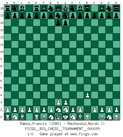 Last move : 1-0 2015 April 13 21:43:48 [Event "FICGS__BIG_CHESS__TOURNAMENT__000099"] [Site "FICGS"] [Date "2015.04.12"] [Round "1"] [White "Ramos,Francis"] [Black "MacDonald,Murdo"] [Result "1-0"] [WhiteElo "1580"] [BlackElo ""] 1.m2-m4 1-0 Follow this game move after move (download)I'd rather have a Pawn than a finger. (Reuben Fine) Obwohl ich alt bin, darf mir niemand den Finger in den Mund stecken, sonst beisse ich. (Wilhelm Steinitz) Nunca antes ha habido un jugador de Ajedrez con tal conocimiento a fondo de las complejidades del juego y una inmensa voluntad absolutamente indomable de ganar. Yo pienso que Fischer es el jugador mas grande que jamás haya existido. (Lisa Lane) Tous ces prétendus hommes politiques sont les pions, les Cavaliers, les Tours ou les Fous d'une partie d'échecs qui se jouera tant qu'un hasard ne renversera pas l'échiquier. (Honoré de Balzac) If you don't practice you don't deserve to win. (Andre Agassi)