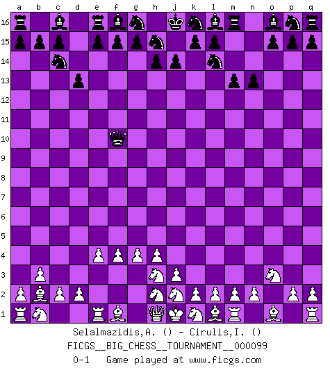 Last move : 0-1 2015 May 23 10:50:47 [Event "FICGS__BIG_CHESS__TOURNAMENT__000099"] [Site "FICGS"] [Date "2015.04.12"] [Round "1"] [White "Selalmazidis,Arsenis"] [Black "Cirulis,Ilmars"] [Result "0-1"] [WhiteElo ""] [BlackElo ""] 1.b2-b3 j15-l14 2.c1-b2 h16-o10 3.h3-h4 o10-o2 4.p1-o3 o2-f10 5.g1-h3 n15-n13 6.g2-g4 m15-m13 7.f2-f4 b16-c14 8.e2-e4 d15-d13 0-1 This big chess game has been lost on time (started : 2015.04.12 18:32:53) Follow this game move after move (download)That's what Chess is all about. One day you give your opponent a lesson, the next day he gives you one. (Bobby Fischer) Die Fehler sind da, Sie warten nur darauf gemacht zu werden. (Savielly Grigorievitsch Tartakower) La vida es como un juego de Ajedrez, cambiando con cada movimiento. (Proverbio Chino) Un journaliste : 'Vous préférez avoir une dame de plus sur l'échiquier ou au lit ?' Boris Spassky : 'Ca dépend de la position.' Warrior pose battles inner weakness and wins focus. You see that there is no war within you. You're on your own side, and you are your own strength. (Terri Guillemets)