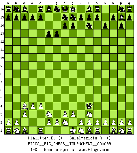 Last move : 1-0 2015 May 23 10:50:47 [Event "FICGS__BIG_CHESS__TOURNAMENT__000099"] [Site "FICGS"] [Date "2015.04.12"] [Round "1"] [White "Klawitter,Bernd"] [Black "Selalmazidis,Arsenis"] [Result "1-0"] [WhiteElo ""] [BlackElo ""] 1.c2-c3 p15-p14 2.d2-d4 g15-g13 3.e2-e4 o16-p15 4.j2-l3 f15-f13 5.f1-c4 n15-n14 6.h1-l4 k16-l14 7.g1-f3 1-0 This big chess game has been lost on time (started : 2015.04.12 18:32:53) Follow this game move after move (download)When you don't know what to play, wait for an idea to come into your opponent's mind. You may be sure that idea will be wrong. (Siegbert Tarrasch) Der Verteidiger gebe der Gewalt nach, aber nur der Gewalt. Er schaffe sich nicht freiwillig, etwa aus Blindheit oder aus Schrecken, irgendwelche Schwächen. Er lasse sich nicht bluffen. (Emanuel Lasker) El Ajedrez es realmente noventa y nueve por ciento calculación. (Soltis) Il n'y a pas de prix trop élevé au scalp de l'ennemi. (Koblentz) That's absurd. I love it. (Gregory House, House M.D.)