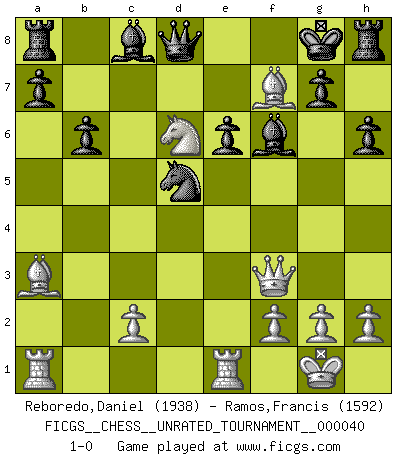 Last move : 1-0 2015 May 3 8:51:18 [Event "FICGS__CHESS__UNRATED_TOURNAMENT__000040"] [Site "FICGS"] [Date "2015.04.14"] [Round "1"] [White "Reboredo,Daniel"] [Black "Ramos,Francis"] [Result "1-0"] [WhiteElo "1938"] [BlackElo "1592"] 1.e4 c5 2.Nf3 d6 3.b4 cxb4 4.d4 b6 5.a3 bxa3 6.Nxa3 Bb7 7.Bd3 Nd7 8.O-O Ngf6 9.Re1 e6 10.Ng5 Be7 11.e5 dxe5 12.dxe5 Nd5 13.Nc4 h6 14.Nxe6 fxe6 15.Bg6+ Kf8 16.Qf3+ N7f6 17.exf6 Bxf6 18.Ba3+ Kg8 19.Nd6 Bc8 20.Bf7+ 1-0 Sicilian : wing gambit deferred Kingside Castling by player White (move 8) Player White won this chess game. Follow this game move after move (download)A great player and a great example for many. His book My 60 Memorable Games had a big impact on me. It is a shame he didn't continue to enrich the world of chess with his unparalleled understanding after 1972. (Jan Timman, about Bobby Fischer's death) Schach ist ein Teil der Kultur, und wenn es mit der Kultur abwärts geht, geht es auch mit dem Schach abwärts. (Mikhail Moiseyevich Botvinik) El Ajedrez es un expediente tonto que hace creer a la gente inactiva que hacen una cosa muy astuta cuando solamente estan perdiendo su tiempo. (George Bernard Shaw) Nous sommes les pions de la mystérieuse partie d'Echecs jouée par Dieu. Il nous déplace, nous arrête, nous pousse encore, puis nous lance un à un dans la boîte du Néant. Epitaphe sur la tombe de David Janowsky (1868-1927). Methinks King Thibault should dub Marius Zubac a knight of the square board... I mean table, henceforth addressing him as Sir Marius, and bestow on him a suitable land from the kingdom of FICGS & marry him off to a worthy, fair maiden, lest he slice our heads with his mighty sword in his wrath. (Dinesh De Silva)
