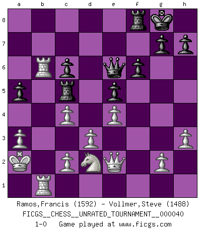 Last move : 1-0 2015 April 26 18:48:0 [Event "FICGS__CHESS__UNRATED_TOURNAMENT__000040"] [Site "FICGS"] [Date "2015.04.14"] [Round "1"] [White "Ramos,Francis"] [Black "Vollmer,Steve"] [Result "1-0"] [WhiteElo "1592"] [BlackElo "1488"] 1.e4 Nf6 2.Nc3 e5 3.Bc4 Bc5 4.d3 c6 5.Be3 Bxe3 6.fxe3 d5 7.exd5 cxd5 8.Bb3 Nc6 9.Qe2 O-O 10.O-O-O Bg4 11.Nf3 a5 12.h3 Bd7 13.Nxd5 Nxd5 14.Bxd5 Nb4 15.e4 Bc6 16.Bxc6 bxc6 17.a3 Na2+ 18.Kb1 Nc3+ 19.bxc3 Qe7 20.Ka2 Rab8 21.Rb1 Rb5 22.c4 Rc5 23.Rb6 Qe6 24.Rhb1 f6 25.Nd2 1-0 Alekhine's defense Kingside Castling by player Black (move 9) Queenside Castling by player White (move 10) Player White won this chess game. Follow this game move after move (download)By the beauty of his games, the clarity of his play, and the brilliance of his ideas, Fischer made himself an artist of the same stature as Brahms, Rembrandt, and Shakespeare. (David Levy) Ohne Leiden bildet sich kein Charakter. (Ernst Freiherr von Feuchtersleben) Nunca antes ha habido un jugador de Ajedrez con tal conocimiento a fondo de las complejidades del juego y una inmensa voluntad absolutamente indomable de ganar. Yo pienso que Fischer es el jugador mas grande que jamás haya existido. (Lisa Lane) En blitz, le Cavalier l'emporte sur le Fou. (Vlastimil Hort) Do not put your faith in what statistics say until you have carefully considered what they do not say. (William W. Watt)