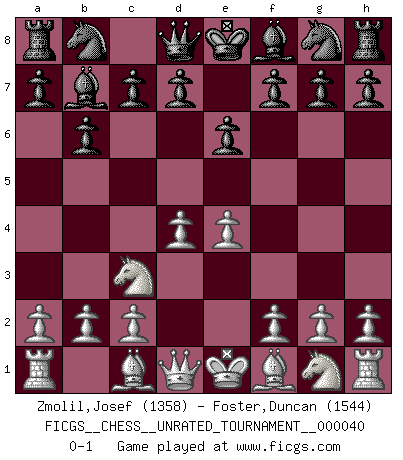 Last move : 0-1 2015 May 26 11:19:14 [Event "FICGS__CHESS__UNRATED_TOURNAMENT__000040"] [Site "FICGS"] [Date "2015.04.14"] [Round "1"] [White "Zmolil,Josef"] [Black "Foster,Duncan"] [Result "0-1"] [WhiteElo "1358"] [BlackElo "1544"] 1.d4 e6 2.e4 b6 3.Nc3 Bb7 0-1 This chess game has been lost on time (started : 2015.04.14 13:4:34) Queen's pawn Player Black won this chess game. Follow this game move after move (download)Only sissies Castle. (Rob Sillars) Deine Wertungszahl - vorausgesetzt einige Jahre schachliche Anstrengung - entspricht etwa dem zehnfachen Deines IQ plus 1000. (Jonathan Levitt) Siempre es mucho mejor sacrificar las piezas de tu oponente. (Savielly Tartakover) Horreur, mais aussi harmonie suprême : qu'y avait-il en effet au monde en dehors des échecs ? Le brouillard, l'inconnu, le non-être... (Vladimir Nabokov) Lamb in skin of tiger, still fears the wolf. (Chinese proverb)