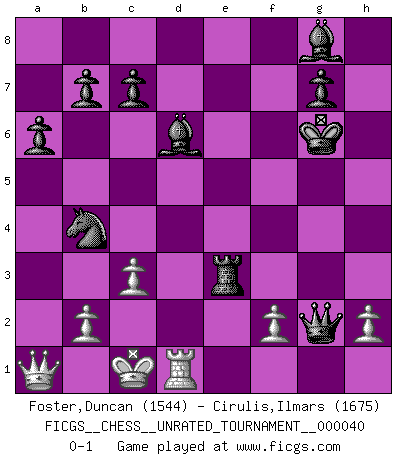 Last move : 0-1 2015 April 22 15:18:59 [Event "FICGS__CHESS__UNRATED_TOURNAMENT__000040"] [Site "FICGS"] [Date "2015.04.14"] [Round "1"] [White "Foster,Duncan"] [Black "Cirulis,Ilmars"] [Result "0-1"] [WhiteElo "1544"] [BlackElo "1675"] 1.e4 e5 2.Nf3 Nf6 3.d4 exd4 4.e5 Ne4 5.Qxd4 d5 6.exd6 Nxd6 7.Nc3 Nc6 8.Qf4 Be7 9.Bd3 Be6 10.Bd2 Qd7 11.O-O-O O-O 12.Rhe1 Rfe8 13.Ne4 Nxe4 14.Bxe4 Bd6 15.Qe3 Bxa2 16.Qg5 a6 17.Bxh7+ Kxh7 18.Qh5+ Kg8 19.Ng5 f6 20.Qh7+ Kf8 21.Qh8+ Bg8 22.Nh7+ Kf7 23.Nxf6 Kxf6 24.Bc3+ Kg6 25.Rxe8 Rxe8 26.Qh4 Qe7 27.Qa4 Qg5+ 28.Bd2 Qxg2 29.Be3 Re4 30.Qa1 Nb4 31.c3 Rxe3 0-1 Petrov : Modern attack, Main line Queenside Castling by player White (move 11) Kingside Castling by player Black (move 11) Player Black won this chess game. Follow this game move after move (download)Chess teaches you to control the initial excitement you feel when you see something that looks good and it trains you to think objectively when you're in trouble. (Stanley Kubrick) Wenn Capablanka heute auf der Schachbühne erscheinen würde, hätte er ein halbes Jahr gebraucht um sich die Schachtheorie anzueignen. Und dann hätte er alles und jeden besiegt. (Mikhail Moiseyevich Botvinik) En el Ajedrez, cuando menos, el valiente hereda la tierra. (Edmar Mednis) Roi des jeux et jeu des rois, les échecs portent en eux un sentiment d'infini. Ils donnent à celui qui s'est efforcé d'en approfondir les arcanes l'impression de n'être pas à la mesure de l'homme; en fait, ils constituent un résumé de l'univers, un microcosme, et figurent cette grande échelle qui, dans les plans de la lumière descend jusqu'à la matière, qui des abîmes insondables remonte jusqu'en l'infini de Dieu. (Pyrame) I've never seen so many men wasted so badly. (Blondie in The Good, The Bad and The Ugly)