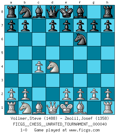 Last move : 1-0 2015 June 2 23:51:46 [Event "FICGS__CHESS__UNRATED_TOURNAMENT__000040"] [Site "FICGS"] [Date "2015.04.14"] [Round "1"] [White "Vollmer,Steve"] [Black "Zmolil,Josef"] [Result "1-0"] [WhiteElo "1488"] [BlackElo "1358"] 1.d4 Nf6 2.c4 c5 3.Nf3 cxd4 4.Nxd4 1-0 This chess game has been lost on time (started : 2015.04.14 13:4:34) Benoni defense Player White won this chess game. Follow this game move after move (download)Chess is the art of analysis. (Mikhail Botvinnik) Sitze auf Deine Hände. (Siegbert Tarrasch) Cada Peón es una Reina en potencia. (James Mason) La tactique, c'est ce que vous faites quand il y a quelque chose à faire; la stratégie, c'est ce que vous faites quand il n'y a rien à faire. (Savielli Tartacower) At last I discovered the true beauty of chess. So I proposed to her. (Dinesh De Silva)