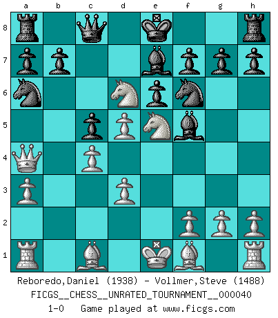 Last move : 1-0 2015 April 17 11:5:52 [Event "FICGS__CHESS__UNRATED_TOURNAMENT__000040"] [Site "FICGS"] [Date "2015.04.14"] [Round "1"] [White "Reboredo,Daniel"] [Black "Vollmer,Steve"] [Result "1-0"] [WhiteElo "1938"] [BlackElo "1488"] 1.e4 c5 2.Nf3 Nc6 3.b4 d5 4.exd5 Nxb4 5.c4 Bf5 6.d3 Nf6 7.Nc3 e6 8.a3 Na6 9.Qa4+ Qd7 10.Nb5 Be7 11.Ne5 Qc8 12.Nd6+ 1-0 Sicilian defense Player White won this chess game. Follow this game move after move (download)You sit at the board and suddenly your heart leaps. Your hand trembles to pick up the piece and move it. But what Chess teaches you is that you must sit there calmly and think about whether it's really a good idea and whether there are other better ideas. (Stanley Kubrick) Alle Schachspieler sollten auch ein Hobby haben. (Savielly Grigorievitsch Tartakower) Las combinaciones han sido siempre el aspecto más intrigante del Ajedrez. Los Maestros las buscan, el público las aplauden, los críticos las alaban. La razón se debe a que las combinaciones hacen posible que el Ajedrez sea más que un ejercicio matemático con una carencia de vida. Ellas son la poesía del juego, son del Ajedrez lo que la melodía es de la música. Ellas representan el triunfo de la mente sobre la materia. (Reuben Fine) Le génie consiste à savoir transgresser les règles au moment opportun. (Teichmann) Waiting for chance ? Play in casinos. (FICGS proverb)