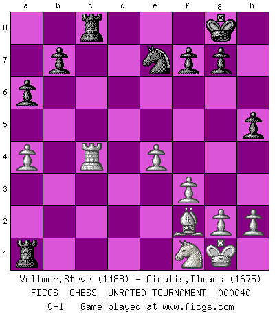 Last move : 0-1 2015 July 3 22:27:46 [Event "FICGS__CHESS__UNRATED_TOURNAMENT__000040"] [Site "FICGS"] [Date "2015.04.14"] [Round "1"] [White "Vollmer,Steve"] [Black "Cirulis,Ilmars"] [Result "0-1"] [WhiteElo "1488"] [BlackElo "1675"] 1.d4 d5 2.c4 dxc4 3.e4 e5 4.Nf3 exd4 5.Bxc4 Nc6 6.O-O Be6 7.Bb5 Bc5 8.Bf4 Nge7 9.Nbd2 a6 10.Ba4 O-O 11.Rc1 Ba7 12.Bb3 Ng6 13.Bg3 Bxb3 14.Qxb3 Bb6 15.Nc4 Re8 16.Nxb6 cxb6 17.Rfe1 Rc8 18.Rcd1 b5 19.a4 b4 20.Qc4 Qd7 21.Nxd4 Rcd8 22.Nxc6 Qxd1 23.f3 Qd3 24.Qxd3 Rxd3 25.Nxb4 Rb3 26.Nd5 Rxb2 27.Rc1 h5 28.Be1 Ne7 29.Ne3 Re2 30.Bf2 Ra2 31.Rc4 Ra1+ 32.Nf1 Rc8 0-1 QGA : 3.e4 Kingside Castling by player White (move 6) Kingside Castling by player Black (move 10) Player Black won this chess game. Follow this game move after move (download)It is the aim of the modern school, not to treat every position according to one general law, but according to the principle inherent in the position. (Richard Reti) Das Spiel gibt uns die Genugtuung, die das Leben uns versagt. (Emanuel Lasker) Repentinamente, me resultaba obvio en mi analisis que yo había pasado por alto lo que Fischer había visto en el tablero con la mas grande facilidad. (Mikhail Botvinnik) Psychologiquement, tu dois avoir confiance en toi même, mais cette confiance doit être basée sur des faits. (Robert Fischer) A bird doesn't sing because it has an answer, it sings because it has a song. (Maya Angelou)