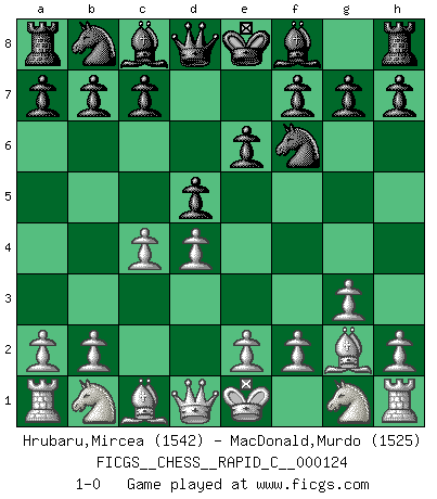 Last move : 1-0 2015 May 4 15:18:33 [Event "FICGS__CHESS__RAPID_C__000124"] [Site "FICGS"] [Date "2015.04.14"] [Round "1"] [White "Hrubaru,Mircea"] [Black "MacDonald,Murdo"] [Result "1-0"] [WhiteElo "1542"] [BlackElo "1525"] 1.d4 e6 2.c4 d5 3.g3 Nf6 4.Bg2 1-0 Queen's pawn Player White won this chess game. Follow this game move after move (download)You sit at the board and suddenly your heart leaps. Your hand trembles to pick up the piece and move it. But what Chess teaches you is that you must sit there calmly and think about whether it's really a good idea and whether there are other better ideas. (Stanley Kubrick) Schach ist Krieg, im Schach geht es um testosterongesteuerte Urschreie. (Garry Kasparov) El jugador táctico debe saber que hacer cuando algo se debe de hacer. El estratégico debe saber que hacer cuando nada se debe de hacer. (Savielly Tartakover) Je ne suis pas le dernier à jouer lâchement des coups douteux pendant le zeïtnot de l'adversaire pour l'achever: en effet les coups qui font le plus peur sont ceux que l'on ne comprend pas. Je me fais souvent peur quand je joue. (Un professeur anonyme) As a goal marker shodan is important. As a destination it is a poor place to stop. (Thomas Tamayo)