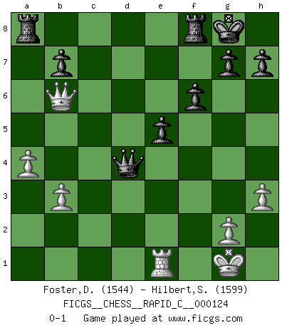 Last move : 0-1 2015 April 26 13:18:58 [Event "FICGS__CHESS__RAPID_C__000124"] [Site "FICGS"] [Date "2015.04.14"] [Round "1"] [White "Foster,Duncan"] [Black "Hilbert,Stephan J."] [Result "0-1"] [WhiteElo "1544"] [BlackElo "1599"] 1.e4 d5 2.exd5 Qxd5 3.Nc3 Qa5 4.d4 Nf6 5.Nf3 Bf5 6.Bd2 c6 7.Bc4 e6 8.O-O Qc7 9.Ne5 Bd6 10.Re1 Nbd7 11.Bf4 Nb6 12.Bb3 O-O 13.h3 Nfd5 14.Nxd5 cxd5 15.Bg3 f6 16.Nd3 Bxg3 17.fxg3 Qxg3 18.Qd2 a5 19.Re3 Qd6 20.Rae1 a4 21.Bxd5 Qxd5 22.b3 Qxd4 23.Qf2 axb3 24.cxb3 Bxd3 25.Rxd3 Qxd3 26.Qxb6 e5 27.a4 Qd4+ 0-1 Scandinavian defense Kingside Castling by player White (move 8) Kingside Castling by player Black (move 12) Player Black won this chess game. Follow this game move after move (download)The isolated Pawn casts gloom over the entire chessboard. (Aaron Nimzovich) Der Verteidiger gebe der Gewalt nach, aber nur der Gewalt. Er schaffe sich nicht freiwillig, etwa aus Blindheit oder aus Schrecken, irgendwelche Schwächen. Er lasse sich nicht bluffen. (Emanuel Lasker) Bobby Fischer es el jugador de Ajedrez mas grande que jamás haya existido. (Ken Smith) C'est une question de caractère, Beaucoup de gens perdent leur motivation très vite. D'autres, ils sont rares, peuvent la conserver très longtemps. J'aime les échecs, encore aujourd'hui je suis heureux d'analyser des parties. J'aime toujours gagner, je déteste encore perdre. Bien jouer est important pour mon intégrité intellectuelle et morale. Et puis les échecs vivent en ce moment une période historique grâce à Internet. Ils se développent dans les systèmes éducatifs à travers le monde. Ils sortent de leur ghetto, et c'est mon rôle de mener à bien cette révolution. (Gary Kasparov) The real voyage of discovery consists not in seeking new lands but in seeing with new eyes. (Marcel Proust)