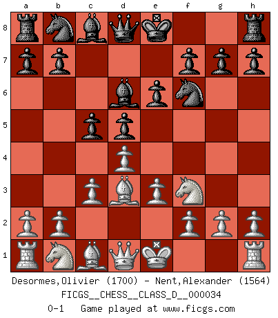 Last move : 0-1 2007 April 20 23:54:24 [Event "FICGS__CHESS__CLASS_D__000034"] [Site "FICGS"] [Date "2007.03.03"] [Round "1"] [White "Desormes,Olivier"] [Black "Nent,Alexander"] [Result "0-1"] [WhiteElo "1700"] [BlackElo "1564"] 1.d4 Nf6 2.Nf3 e6 3.e3 c5 4.c3 d5 5.Bd3 Bd6 0-1 This chess game has been lost on time (started : 2007.03.03 17:51:14) Queen's pawn : Yusupov-Rubinstein system Player Black won this chess game. Follow this game move after move (download)Discovered check is the dive bomber of the Chessboard. (Reuben Fine) Es war undenkbar für die Behörden, dass ein sowjetischer Großmeister auf diese Art und Weise [Fischer-Taimanov 6:0] verliert, ohne dass es eine politischer Erklärung dafür gäbe. (Mark Taimanov) Me gusta decir que Bobby Fischer fue el mejor jugador que jamás haya existido. Pero lo que hizo de Fischer un genio, fue su habilidad de mezclar una frescura y pragmatismo Americano con ideas Rusas acerca de la estrategia. (Bruce Pandolfini) Les Echecs ont trois composantes : le temps, l'espace et le matériel en dernier. (Mikhail Tal) There are two kinds of people in the world, my friend. Those who have a loaded gun and those who dig. You dig ! (Blondie in The Good, The Bad and The Ugly)