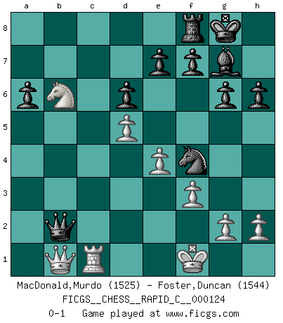 Last move : 0-1 2015 April 28 20:54:3 [Event "FICGS__CHESS__RAPID_C__000124"] [Site "FICGS"] [Date "2015.04.14"] [Round "1"] [White "MacDonald,Murdo"] [Black "Foster,Duncan"] [Result "0-1"] [WhiteElo "1525"] [BlackElo "1544"] 1.e4 b6 2.d4 Bb7 3.d5 g6 4.Nf3 Bg7 5.Nc3 d6 6.Bb5+ Nd7 7.Bf4 a6 8.Ba4 b5 9.Bb3 Nc5 10.O-O Nxb3 11.axb3 h6 12.Ne2 Bxb2 13.Rb1 Bg7 14.c4 Nf6 15.Nc3 bxc4 16.bxc4 O-O 17.Rxb7 Nh5 18.Bd2 Qc8 19.Rb1 Rb8 20.Na4 Qd7 21.Ba5 Rxb1 22.Qxb1 Qxa4 23.Bxc7 Qxc4 24.Nd2 Qxc7 25.Rc1 Qa5 26.Nc4 Qa4 27.f3 Nf4 28.Nb6 Qd4+ 29.Kf1 Qb2 0-1 Owen defense Kingside Castling by player White (move 10) Kingside Castling by player Black (move 16) Player Black won this chess game. Follow this game move after move (download)Those who say they understand Chess, understand nothing. (Robert Hubner) Das ganze Leben mit einer Ehefrau ist wie ein Endspiel mit ungleichfarbigen Läufern. (Viktor Kortschnoi) La belleza de un movimiento no se refleja solo en su apariencia, sino en el pensamiento detrás de él. (Siegbert Tarrasch) On est toujours la mazette de quelqu'un d'autre. (Anonyme) Wipe them out. All of them. (Darth Sidious in Star Wars ep.1)