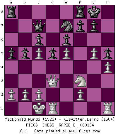 Last move : 0-1 2015 May 2 11:28:43 [Event "FICGS__CHESS__RAPID_C__000124"] [Site "FICGS"] [Date "2015.04.14"] [Round "1"] [White "MacDonald,Murdo"] [Black "Klawitter,Bernd"] [Result "0-1"] [WhiteElo "1525"] [BlackElo "1604"] 1.e4 c6 2.d4 d5 3.e5 Bf5 4.Nc3 e6 5.Nf3 Bb4 6.Bd2 Ne7 7.Na4 Bxd2+ 8.Qxd2 O-O 9.Nc5 Qc7 10.Bd3 Bxd3 11.Qxd3 h6 12.O-O-O Nd7 13.h4 Nxc5 14.dxc5 b5 15.g4 a5 16.g5 h5 0-1 Caro-Kann : Advance variation Kingside Castling by player Black (move 8) Queenside Castling by player White (move 12) Player Black won this chess game. Follow this game move after move (download)Half the variations which are calculated in a tournament game turn out to be completely superfluous. Unfortunately, no one knows in advance which half. (Jan Tinman) Deine Wertungszahl - vorausgesetzt einige Jahre schachliche Anstrengung - entspricht etwa dem zehnfachen Deines IQ plus 1000. (Jonathan Levitt) Todo lo que importa ante el tablero de Ajedrez son buenas jugadas. (Bobby Fischer) Il n'y a pas de prix trop élevé au scalp de l'ennemi. (Koblentz) You know what they say : You lie down with the Devil, you wake up in Hell. (Horatio Caine, C.S.I. Miami)