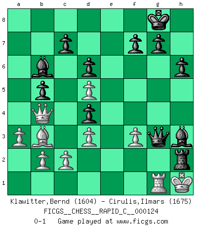 Last move : 0-1 2015 May 13 10:50:41 [Event "FICGS__CHESS__RAPID_C__000124"] [Site "FICGS"] [Date "2015.04.14"] [Round "1"] [White "Klawitter,Bernd"] [Black "Cirulis,Ilmars"] [Result "0-1"] [WhiteElo "1604"] [BlackElo "1675"] 1.e4 e5 2.Nf3 Nf6 3.Nc3 Nc6 4.Bc4 Bc5 5.d3 O-O 6.O-O h6 7.h3 d6 8.Qe2 a6 9.Be3 Nd4 10.Bxd4 exd4 11.Nd5 Nxd5 12.exd5 Re8 13.Qd2 b5 14.Bb3 Qf6 15.a3 Bxh3 16.Nh2 Qg6 17.f3 Re3 18.Rf2 Rae8 19.Kh1 Bd7 20.Nf1 a5 21.Qxa5 Re2 22.Kg1 Bb6 23.Qb4 Bh3 24.g4 Bxg4 25.Ng3 Bh3 26.Rxe2 Qxg3+ 27.Kh1 Rxe2 28.Rg1 Rh2+ 0-1 Petrov Three knights game Kingside Castling by player Black (move 5) Kingside Castling by player White (move 6) Player Black won this chess game. Follow this game move after move (download)Modern Chess is too much concerned with things like Pawn structure. Forget it, Checkmate ends the game. (Nigel Short) Ein Kibitz ist einer, der deinem Gegner gute Ratschläge gibt. (Andrew Soltis) Aquellos que dicen entender al Ajedrez, no entienden nada. (Robert Hubner) Le génie consiste à savoir transgresser les règles au moment opportun. (Teichmann) Employ the attack like tactic of defense. (Chinese proverb)