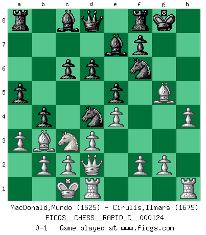 Last move : 0-1 2015 April 28 20:54:46 [Event "FICGS__CHESS__RAPID_C__000124"] [Site "FICGS"] [Date "2015.04.14"] [Round "1"] [White "MacDonald,Murdo"] [Black "Cirulis,Ilmars"] [Result "0-1"] [WhiteElo "1525"] [BlackElo "1675"] 1.e4 e5 2.Nf3 Nf6 3.Nc3 Nc6 4.Bc4 Bc5 5.d3 O-O 6.Bg5 h6 7.Bh4 g5 8.Nxg5 hxg5 9.Bxg5 Be7 10.Qe2 Nd4 11.Qd2 d6 12.O-O-O c6 13.h4 b5 14.Bb3 a5 15.a3 b4 0-1 Petrov Three knights game Kingside Castling by player Black (move 5) Queenside Castling by player White (move 12) Player Black won this chess game. Follow this game move after move (download)You have to have the fighting spirit. You have to force moves and take chances. (Bobby Fischer) Matt entspricht nicht immer den Tatsachen. (Savielly Grigorievitsch Tartakower) Cada Peón es potencialmente una Reina. (James Mason) Si rien de grave n'est détecté lors de l'analyse d'une position, on joue alors le coup. Seconde règle de Blumenfeld. If you are going through hell, keep going. (Winston Churchill)