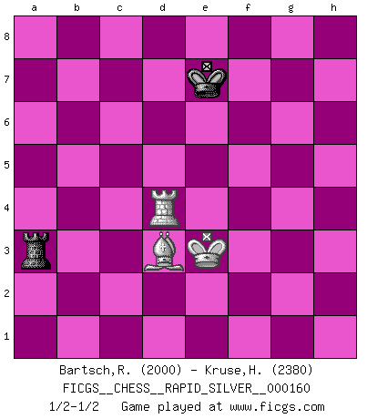 Last move : 1/2-1/2 2015 May 24 7:50:27 [Event "FICGS__CHESS__RAPID_SILVER__000160"] [Site "FICGS"] [Date "2015.04.16"] [Round "2"] [White "Bartsch,Reinhard Andrea"] [Black "Kruse,Herbert"] [Result "1/2-1/2"] [WhiteElo "2000"] [BlackElo "2380"] 1.d4 Nf6 2.c4 c6 3.Nf3 d5 4.Nc3 e6 5.e3 Nbd7 6.Qc2 Bd6 7.Bd3 dxc4 8.Bxc4 O-O 9.O-O b5 10.Bd3 Bb7 11.a3 a6 12.Ng5 h6 13.Nge4 Bb8 14.f4 a5 15.Bd2 Qe7 16.Rac1 Rc8 17.b4 axb4 18.axb4 Ra3 19.Nxf6+ Nxf6 20.Qb2 Ra6 21.Ra1 Rxa1 22.Rxa1 g5 23.Ne4 gxf4 24.exf4 Nxe4 25.Bxe4 Rd8 26.g3 Qd7 27.Be3 c5 28.Bxb7 cxd4 29.Qxd4 Qxd4 30.Bxd4 Rxd4 31.Ra8 Rd8 32.Ra5 Rd4 33.Rxb5 Bd6 34.Kf2 Rd2+ 35.Kg1 Rd4 36.Kf2 Rd2+ 37.Kg1 Rb2 38.f5 Rb1+ 39.Kf2 Rb2+ 40.Kg1 Bxb4 41.fxe6 fxe6 42.Bc8 Kf7 43.h4 Ke7 44.Re5 Kd8 45.Bxe6 Bd6 46.Rh5 Bxg3 47.Rxh6 Ke7 48.Bc4 Bf2+ 49.Kf1 Rc2 50.Be2 Bxh4 51.Rxh4 Rb2 52.Kf2 Rb3 53.Rd4 Ra3 54.Bd3 Rc3 55.Ke3 Ra3 1/2-1/2 Queen's pawn game Kingside Castling by player Black (move 8) Kingside Castling by player White (move 9) 10 pieces endgame at move 41 : White KRBPP , Black KRBPP WHITE : King + 1 Rook 1 Bishop 2 Pawns BLACK : King + 1 Rook 1 Bishop 2 Pawns 9 pieces endgame at move 45 : White KRBPP , Black KRBP WHITE : King + 1 Rook 1 Bishop 2 Pawns BLACK : King + 1 Rook 1 Bishop 1 Pawn 8 pieces endgame at move 46 : White KRBP , Black KRBP WHITE : King + 1 Rook 1 Bishop 1 Pawn BLACK : King + 1 Rook 1 Bishop 1 Pawn 7 pieces endgame at move 47 : White KRBP , Black KRB WHITE : King + 1 Rook 1 Bishop 1 Pawn BLACK : King + 1 Rook 1 Bishop 6 pieces endgame at move 50 : White KRB , Black KRB WHITE : King + 1 Rook 1 Bishop BLACK : King + 1 Rook 1 Bishop 5 pieces endgame at move 51 : White KRB , Black KR WHITE : King + 1 Rook 1 Bishop BLACK : King + 1 Rook This chess game ended in a draw. Follow this game move after move (download)When I asked Fischer why he had not played a certain move in our game, he replied: 'Well, you laughed when I wrote it down !' (Mikhail Tal) Ich glaube nicht an Psychologie, ich glaube an gute Züge. (Robert James Fischer) Bobby es la celebridad menos entendida y malinterpretada que camina el la faz de esta tierra. (Yasser Seirawan) La menace est plus forte que l'exécution. (Aaron Nimzovitch) Without deviation from the norm, progress is not possible. (Frank Zappa)