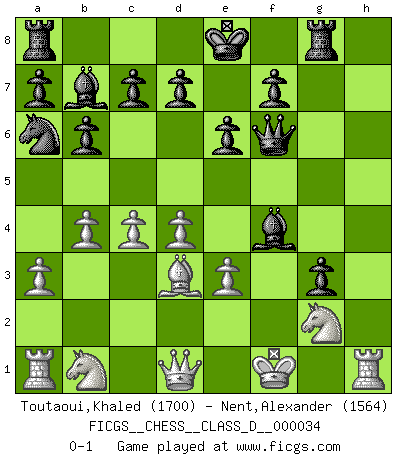Last move : 0-1 2007 May 11 17:7:3 [Event "FICGS__CHESS__CLASS_D__000034"] [Site "FICGS"] [Date "2007.03.03"] [Round "1"] [White "Toutaoui,Khaled"] [Black "Nent,Alexander"] [Result "0-1"] [WhiteElo "1700"] [BlackElo "1564"] 1.d4 Nf6 2.Nf3 e6 3.c4 b6 4.Bg5 Bb7 5.e3 h6 6.Bh4 g5 7.Bg3 Ne4 8.Bd3 Bb4+ 9.Ke2 g4 10.Nh4 Be7 11.f3 Nxg3+ 12.hxg3 gxf3+ 13.gxf3 Rg8 14.Kf2 Bd6 15.g4 h5 16.Ng2 hxg4 17.f4 Na6 18.a3 Qf6 19.b4 g3+ 20.Kf1 Bxf4 0-1 Queen's pawn game Player Black won this chess game. Follow this game move after move (download)I play correspondence chess because it is both art and science while chess is art only. (A player at FICGS) Die jungen Leute sollen verstehen, dass sie noch etwas von mir lernen können und müssen. (Viktor Kortschnoi) Mis oponentes también hacen buenas movidas. A veces yo no tomo esas cosas en consideración. (Bobby Fischer) Il vaut toujours mieux jouer un plan faux de façon logique que de n'avoir pas de plan du tout. (Victor Kortchnoï) If I had no sense of humor, I would long ago have committed suicide. (Mahatma Gandhi)