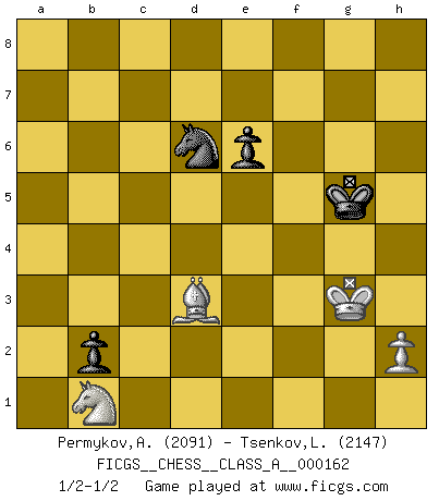 Last move : 1/2-1/2 2015 May 7 20:27:36 [Event "FICGS__CHESS__CLASS_A__000162"] [Site "FICGS"] [Date "2015.04.17"] [Round "1"] [White "Permykov,Andrey"] [Black "Tsenkov,Ljubomir"] [Result "1/2-1/2"] [WhiteElo "2091"] [BlackElo "2147"] 1.e4 c5 2.Nc3 a6 3.Nf3 d6 4.d4 cxd4 5.Nxd4 Nf6 6.Bg5 e6 7.f4 b5 8.e5 dxe5 9.fxe5 Qc7 10.exf6 Qe5+ 11.Be2 Qxg5 12.O-O Ra7 13.Qd3 Rd7 14.Ne4 Qe5 15.Nf3 Qxb2 16.Qe3 Bb7 17.Rab1 Qxa2 18.c4 Bxe4 19.fxg7 Bxg7 20.Qxe4 Rd6 21.Ng5 Rd4 22.Qe3 Qd2 23.Qxd2 Rxd2 24.Bh5 Bd4+ 25.Kh1 Rf2 26.Rxf2 Bxf2 27.Rf1 Ke7 28.Rxf2 f6 29.Ne4 Rc8 30.g4 Nd7 31.cxb5 axb5 32.Rb2 Rc4 33.Nf2 Rc5 34.Kg1 Ne5 35.Rb3 Rc1+ 36.Kg2 Rc2 37.Kg3 Rc5 38.Ra3 b4 39.Ra7+ Kd8 40.Ne4 Rb5 41.g5 fxg5 42.Be2 Rb6 43.Ra5 Nc6 44.Rxg5 b3 45.Rb5 Rxb5 46.Bxb5 b2 47.Bd3 Ne5 48.Bb1 Nc4 49.Nc3 Ke7 50.Bxh7 Kf6 51.Nb1 Kg5 52.Bd3 Nd6 1/2-1/2 Sicilian : Closed Kingside Castling by player White (move 12) 10 pieces endgame at move 45 : White KBNP , Black KRNPPP WHITE : King + 1 Bishop 1 Knight 1 Pawn BLACK : King + 1 Rook 1 Knight 3 Pawns 9 pieces endgame at move 46 : White KBNP , Black KNPPP WHITE : King + 1 Bishop 1 Knight 1 Pawn BLACK : King + 1 Knight 3 Pawns 8 pieces endgame at move 50 : White KBNP , Black KNPP WHITE : King + 1 Bishop 1 Knight 1 Pawn BLACK : King + 1 Knight 2 Pawns This chess game ended in a draw. Follow this game move after move (download)By playing at Chess then, we may learn: First: Foresight... Second: Circumspection... Third: Caution... And lastly, we learn by Chess the habit of not being discouraged by present bad appearances in the state of our affairs, the habit of hoping for a favorable chance, and that of persevering in the secrets of resources. (Benjamin Franklin) Alle Schachspieler sollten auch ein Hobby haben. (Savielly Grigorievitsch Tartakower) Me siento como si fuera una pieza en una partida de Ajedrez, cuando mi oponente me indica: esa pieza no puede ser movida. (Soren Kierkegaard) Mon pion favori sur ma case favorite ! Bronstein en parlant d'un coup de pion en h5 quand il avait les Noirs. That's absurd. I love it. (Gregory House, House M.D.)