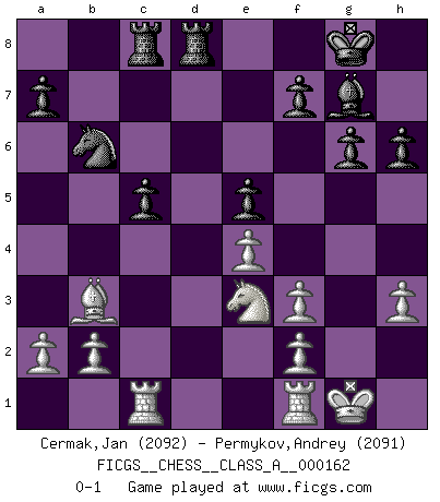 Last move : 0-1 2015 July 13 16:28:54 [Event "FICGS__CHESS__CLASS_A__000162"] [Site "FICGS"] [Date "2015.04.17"] [Round "1"] [White "Cermak,Jan"] [Black "Permykov,Andrey"] [Result "0-1"] [WhiteElo "2092"] [BlackElo "2091"] 1.d4 d5 2.c4 c6 3.Nf3 Nf6 4.Nc3 e6 5.Bg5 h6 6.Bxf6 Qxf6 7.e3 Nd7 8.Bd3 dxc4 9.Bxc4 g6 10.O-O Bg7 11.e4 e5 12.d5 Nb6 13.Bb3 Bg4 14.Rc1 O-O 15.h3 Bxf3 16.Qxf3 Qxf3 17.gxf3 Rfd8 18.dxc6 bxc6 19.Nd1 Rac8 20.Ne3 c5 0-1 QGD Slav : 4.Nc3 Kingside Castling by player White (move 10) Kingside Castling by player Black (move 14) Player Black won this chess game. Follow this game move after move (download)War is the child of passion, passion is the child of narcissism and narcissism is the child. (...) Another game ? (Thibault de Vassal) Ich habe die besten Aussichten, den ersten Preis zu gewinnen - denn jeder muss gegen Steinitz spielen, nur ich nicht! (Wilhelm Steinitz) Yo tuve un dolor de muelas en la primer partida. En el segundo juego, tuve un dolor de cabeza. En el tercero, tuve un ataque de reumatísmo. En la cuarta partida, no me sentía muy bien. ¿Y en el quinto juego? Bueno, ¿que acaso uno tiene que ganar todos los juegos?. (Siegbert Tarrasch) L'attaque fait le spectacle, la défense gagne les matchs. (Dicton footballistique) Hold em is to stud what chess is to checkers. (Johnny Moss)
