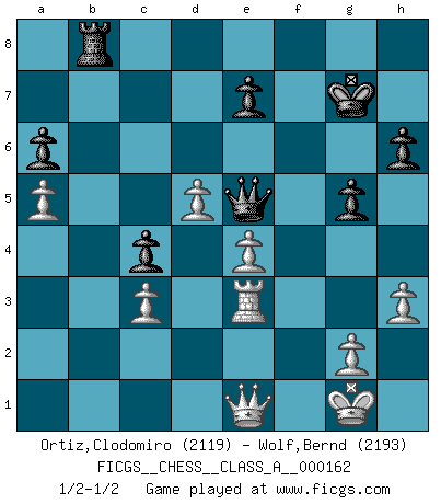 Last move : 1/2-1/2 2015 June 17 21:55:35 [Event "FICGS__CHESS__CLASS_A__000162"] [Site "FICGS"] [Date "2015.04.17"] [Round "1"] [White "Ortiz,Clodomiro"] [Black "Wolf,Bernd"] [Result "1/2-1/2"] [WhiteElo "2119"] [BlackElo "2193"] 1.d4 g6 2.c4 Bg7 3.Nf3 c5 4.d5 f5 5.Nc3 Bxc3+ 6.bxc3 Qa5 7.Qc2 d6 8.Bf4 Nd7 9.Nd2 Ngf6 10.e3 b5 11.a4 bxc4 12.Bxc4 O-O 13.O-O Bb7 14.Rfd1 Ba6 15.Qd3 Bxc4 16.Nxc4 Qa6 17.a5 Kg7 18.f3 Nh5 19.Bg5 Rf7 20.e4 fxe4 21.Qxe4 Re8 22.Bc1 Ref8 23.Re1 Nf4 24.Bd2 h6 25.Ra4 g5 26.Bxf4 Rxf4 27.Qc2 R8f7 28.Re6 Rxc4 29.Qg6+ Kf8 30.Qd3 Ne5 31.Rxe5 dxe5 32.Qxc4 Qd6 33.Ra1 Kg7 34.Re1 Rf4 35.Qa2 a6 36.h3 e4 37.fxe4 Qe5 38.Qc2 c4 39.Re3 Rf8 40.Qe2 Rb8 41.Qe1 1/2-1/2 Modern defense Kingside Castling by player Black (move 12) Kingside Castling by player White (move 13) This chess game ended in a draw. Follow this game move after move (download)Chess is imagination. (David Bronstein) Sicherlich können nur Meister einen Stil haben. Daß ein nicht-Meister auch nur ein einziges Mal in seinem Leben eine Partie folgerecht durchführte, habe ich niemals bemerkt. (Emanuel Lasker) Los problemas de Ajedrez exigen del compositor las mismas virtudes que caracterizan todo el arte de valor: originalidad, invención, concisión, armonía, complejidad e insinceridad explendida. (Vladimir Nabokov) Une platitude souvent récitée à propos des Echecs est qu'une des choses les plus difficiles à réaliser est de gagner une position gagnante. Cela ne manque pas de sens mais, pour ma part, j'ai toujours trouvé plus difficile de gagner une position perdante. (Tim Krabbe) Luck is when opportunity knocks and you answer. (Anonymous)