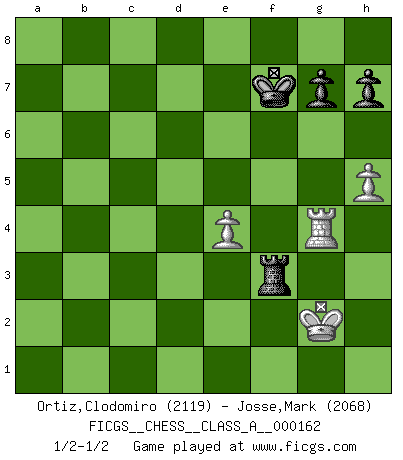 Last move : 1/2-1/2 2015 May 13 19:11:47 [Event "FICGS__CHESS__CLASS_A__000162"] [Site "FICGS"] [Date "2015.04.17"] [Round "1"] [White "Ortiz,Clodomiro"] [Black "Josse,Mark"] [Result "1/2-1/2"] [WhiteElo "2119"] [BlackElo "2068"] 1.d4 Nf6 2.c4 e6 3.Nf3 d5 4.Nc3 c6 5.e3 Nbd7 6.Qc2 Bd6 7.Bd3 dxc4 8.Bxc4 b5 9.Bd3 Bb7 10.e4 e5 11.Be3 O-O 12.dxe5 Nxe5 13.Nxe5 Bxe5 14.h3 Re8 15.O-O a6 16.Rfd1 Qe7 17.Ne2 c5 18.Bxc5 Qc7 19.f3 Bxb2 20.Rab1 Be5 21.Be3 Qxc2 22.Bxc2 Rac8 23.Bb3 a5 24.Nd4 Ba6 25.a4 b4 26.Rbc1 Rxc1 27.Rxc1 Bxd4 28.Bxd4 Rc8 29.Rd1 Nd7 30.Bf2 Ne5 31.Rd5 Nc4 32.Rd7 Ne5 33.Re7 Bc4 34.Rxe5 Bxb3 35.Rxa5 Bc4 36.Ra7 Rb8 37.Bd4 b3 38.a5 f6 39.a6 Bxa6 40.Rxa6 b2 41.Bxb2 Rxb2 42.h4 Kf7 43.h5 Rb5 44.g4 Rb2 45.Ra7+ Kg8 46.Ra5 Kf7 47.Ra6 Rd2 48.Ra7+ Kg8 49.Ra5 Kf7 50.g5 fxg5 51.Rf5+ Ke6 52.Rxg5 Kf7 53.Rg2 Rd3 54.Rg4 Rxf3 55.Kg2 1/2-1/2 Queen's pawn game Kingside Castling by player Black (move 11) Kingside Castling by player White (move 15) 10 pieces endgame at move 50 : White KRPPP , Black KRPPP WHITE : King + 1 Rook 3 Pawns BLACK : King + 1 Rook 3 Pawns 9 pieces endgame at move 52 : White KRPPP , Black KRPP WHITE : King + 1 Rook 3 Pawns BLACK : King + 1 Rook 2 Pawns 8 pieces endgame at move 54 : White KRPP , Black KRPP WHITE : King + 1 Rook 2 Pawns BLACK : King + 1 Rook 2 Pawns This chess game ended in a draw. Follow this game move after move (download)Chess is no whit inferior to the violin, and we have a large number of professional violinists. (Mikhail Botvinnik) Schach verlangt totale Konzentration. (Robert James Fischer) Hoy en día, si tu no eres un Gran Maestro a los 14 años, es mejor que lo olvides. (Anand Viswanathan) Ne tendez aucun piège pour le plaisir ! Ne jouez rien dans l'espoir que l'adversaire réagisse de façon stupide ! Prenez toujours pour acquis que l'adversaire va trouver le meilleur coup ! Ne jouez jamais de coup dans l'espoir que l'adversaire ne voie pas la menace ! Chacun de vos coups doit améliorer la position d'une façon ou d'une autre. It's not the will to win, but the will to prepare to win that makes the difference. (Bear Bryant)