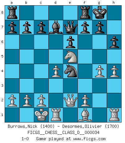 Last move : 1-0 2007 May 27 17:16:17 [Event "FICGS__CHESS__CLASS_D__000034"] [Site "FICGS"] [Date "2007.03.03"] [Round "1"] [White "Burrows,Nick"] [Black "Desormes,Olivier"] [Result "1-0"] [WhiteElo "1400"] [BlackElo "1700"] 1.e4 e6 2.d4 d5 3.Nc3 dxe4 4.Nxe4 Nd7 5.Nf3 Ngf6 6.Bg5 Be7 7.Nxf6+ Bxf6 8.h4 h6 9.Bxf6 Nxf6 10.Qd2 O-O 11.O-O-O Bd7 12.Ne5 Qe7 13.g4 Ne4 14.Qe2 1-0 This chess game has been lost on time (started : 2007.03.03 17:51:14) French : Rubinstein variation Kingside Castling by player Black (move 10) Queenside Castling by player White (move 11) Player White won this chess game. Follow this game move after move (download)If you aren't afraid of Spassky, then I have removed the element of money. (Jim Slater) Im Schach nämlich geht es darum, daß Ich des Gegners klein zu kriegen, sein Ego zu zerbrechen und zu zermahlen, seine Selbstachtung zu zertreten und zu verscharren und seine ganze mißachtenswerte sogenannte Persönlichkeit ein für alle Mal tot zu hacken und zu zerstampfen und dadurch die menschliche Gesellschaft von einer stinkenden Pestbeule zu befreien. Es ist ein königliches Spiel. (Robert James Fischer) El Ajedrez no es como la vida... ¡tiene reglas!. (Mark Pasternak) 'L'échange des dames est un coup dur pour les deux adversaires...' Un journaliste lors d'une partie du match Spassky-Fischer Just because you do not take an interest in politics doesn't mean politics won't take an interest in you. (Pericles 430 B.C.)