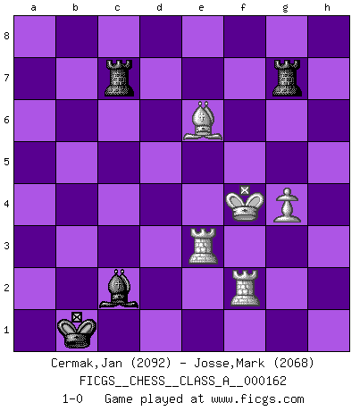 Last move : 1-0 2015 July 12 0:42:30 [Event "FICGS__CHESS__CLASS_A__000162"] [Site "FICGS"] [Date "2015.04.17"] [Round "1"] [White "Cermak,Jan"] [Black "Josse,Mark"] [Result "1-0"] [WhiteElo "2092"] [BlackElo "2068"] 1.d4 Nf6 2.c4 e6 3.Nf3 d5 4.Nc3 c6 5.Bg5 h6 6.Bh4 dxc4 7.e4 g5 8.Bg3 b5 9.Be2 Bb7 10.O-O Nbd7 11.Ne5 Bg7 12.Nxd7 Nxd7 13.Bd6 a6 14.a4 e5 15.Bg4 exd4 16.e5 c5 17.Re1 Nxe5 18.Bxe5 O-O 19.Bxg7 Kxg7 20.Ne2 f5 21.Bh5 f4 22.Nxd4 cxd4 23.Re6 Rf6 24.Qe1 Bd5 25.Re7+ Kg8 26.axb5 Qd6 27.h3 a5 28.Bg4 Bf7 29.Qe4 Qd5 30.Qxd5 Bxd5 31.Rd7 Bf7 32.Rxd4 Be8 33.Bf3 Rb8 34.Rxa5 Bxb5 35.Ra7 Kf8 36.Rh7 Kg8 37.Rc7 Kf8 38.Rc5 Re6 39.h4 Be8 40.hxg5 hxg5 41.Rxg5 Re1+ 42.Kh2 Rxb2 43.Rxc4 Rxf2 44.Rxf4+ Ke7 45.Rg7+ Kd6 46.Rb7 Ra2 47.Rf6+ Ke5 48.R7b6 Kd4 49.Rf5 Re7 50.Rd6+ Ke3 51.Rd1 Ra4 52.Kg1 R4a7 53.Bd5 Bg6 54.Rf3+ Ke2 55.Rdf1 Kd2 56.Bc4 Rac7 57.R1f2+ Kc1 58.Rc3+ Kb1 59.Kh2 Rh7+ 60.Kg3 Rhe7 61.Kh4 Red7 62.g4 Bh7 63.Kh5 Be4 64.Ba2+ Ka1 65.Ra3 Rh7+ 66.Kg5 Rhg7+ 67.Kf4 Bc2 68.Be6 Kb1 69.Re3 1-0 Queen's pawn game Kingside Castling by player White (move 10) Kingside Castling by player Black (move 18) 10 pieces endgame at move 43 : White KRRBP , Black KRRBP WHITE : King + 2 Rooks 1 Bishop 1 Pawn BLACK : King + 2 Rooks 1 Bishop 1 Pawn 9 pieces endgame at move 44 : White KRRBP , Black KRRB WHITE : King + 2 Rooks 1 Bishop 1 Pawn BLACK : King + 2 Rooks 1 Bishop Player White won this chess game. Follow this game move after move (download)All I want to do, ever, is just play Chess. (Bobby Fischer) Ich habe die Schachforschung dermaßen betrieben, dass sie auf eine wissenschaftliche Basis gestellt wurde. (Mikhail Moiseyevich Botvinik) El hombre es un frívolo, una creatura engañosa y como un jugador de Ajedrez, se preocupa mas por el proceso de obtener su meta que de la meta por sí misma. (Dostoyevsky) La menace est plus forte que l'exécution. (Aaron Nimzovitch) There are 10 types of people in this world: those who understand binary and those who don't. (Anonymous)