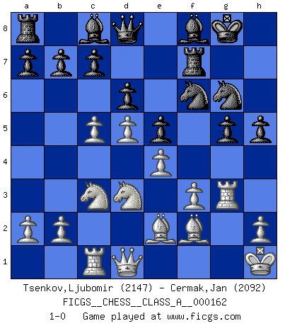 Last move : 1-0 2015 July 19 6:6:38 [Event "FICGS__CHESS__CLASS_A__000162"] [Site "FICGS"] [Date "2015.04.17"] [Round "1"] [White "Tsenkov,Ljubomir"] [Black "Cermak,Jan"] [Result "1-0"] [WhiteElo "2147"] [BlackElo "2092"] 1.c4 Nf6 2.Nc3 g6 3.d4 Bg7 4.e4 d6 5.Be2 O-O 6.Nf3 e5 7.O-O Nc6 8.d5 Ne7 9.Ne1 Nd7 10.Be3 f5 11.f3 f4 12.Bf2 g5 13.Nd3 Nf6 14.c5 Ng6 15.Rc1 Rf7 16.Kh1 Bf8 17.Rg1 h5 18.g3 fxg3 19.Rxg3 1-0 This chess game has been lost on time (started : 2015.04.17 13:31:19) English Opening Kingside Castling by player Black (move 5) Kingside Castling by player White (move 7) Player White won this chess game. Follow this game move after move (download)Chess is a terrible game. If you have no center, your opponent has a freer position. If you do have a center, then you really have something to worry about ! (Siegbert Tarrasch) Ein Remis kann durch Wiederholung von drei Zügen oder durch einen schlechte Zug erreicht werden. (Savielly Grigorievitsch Tartakower) Yo creo que el Ajedrez posee una magia que es también una ayuda en la edad avanzada. Una rodilla reumática es olvidada durante una partida de Ajedrez y otros eventos pueden parecer algo sin importancia comparada a una catástrofe en el tablero de Ajedrez. (Vlastimil Hort) Il vaut mieux sacrifier les pièces de l'adversaire. (Xavier Tartacover) Now you put water in a cup, it becomes the cup; You put water into a bottle it becomes the bottle; You put it in a teapot it becomes the teapot. Water can flow or it can crash. Be water, my friend. (Bruce Lee)