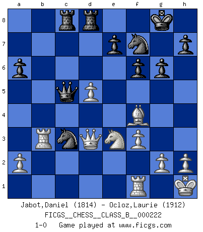 Last move : 1-0 2015 December 22 21:26:38 [Event "FICGS__CHESS__CLASS_B__000222"] [Site "FICGS"] [Date "2015.04.19"] [Round "1"] [White "Jabot,Daniel"] [Black "Ocloz,Laurie"] [Result "1-0"] [WhiteElo "1814"] [BlackElo "1912"] 1.e4 c5 2.Nf3 g6 3.d4 Bg7 4.c4 cxd4 5.Nxd4 Qb6 6.Nb3 Nc6 7.Be3 Qd8 8.Nd4 Qb6 9.Nb5 Qa5+ 10.N1c3 Nf6 11.f3 O-O 12.Qd2 a6 13.Na3 d6 14.Be2 Be6 15.O-O Nd7 16.Rac1 Rac8 17.Nc2 Bxc3 18.bxc3 Nce5 19.Bh6 Rfe8 20.Rb1 Bxc4 21.Bxc4 Nxc4 22.Qd4 Nce5 23.Rxb7 Nc5 24.R7b1 Na4 25.Rb3 Nxc3 26.Qd2 Qc5+ 27.Ne3 f6 28.Kh1 Red8 29.Bf4 Nf7 30.Qd3 d5 31.exd5 1-0 Sicilian : Hungarian variation Kingside Castling by player Black (move 11) Kingside Castling by player White (move 15) Player White won this chess game. Follow this game move after move (download)You can only get good at Chess if you love the game. (Bobby Fischer) Heutzutage gewinnt im Turnier nicht derjenige Spieler, der weitreichende Pläne entwirft, sondern einfach jener, der Zug um Zug kämpft. (David Bronstein) No todos los artistas son jugadores de Ajedrez, pero todos los jugadores de Ajedrez son artistas. (Marcel Duchamp) Echiquier : carré parfait, comme la Jérusalem nouvelle décrite par l'auteur de l'Apocalypse, huit cases sur huit, exaltation du chiffre 4, symbole du cosmos aux quatre horizons... où le noir et le blanc, l'ombre et la lumière, le mal et le bien s'entremêlent et se conjuguent. (Robert Couffignal, Le Gambit du poète) Warrior pose battles inner weakness and wins focus. You see that there is no war within you. You're on your own side, and you are your own strength. (Terri Guillemets)