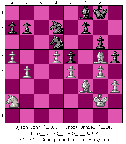 Last move : 1/2-1/2 2015 August 22 18:38:48 [Event "FICGS__CHESS__CLASS_B__000222"] [Site "FICGS"] [Date "2015.04.19"] [Round "1"] [White "Dyson,John"] [Black "Jabot,Daniel"] [Result "1/2-1/2"] [WhiteElo "1989"] [BlackElo "1814"] 1.d4 Nf6 2.c4 g6 3.Nc3 Bg7 4.e4 d6 5.Be2 O-O 6.Bg5 Na6 7.f4 c6 8.Qd2 Nc7 9.Bf3 Be6 10.d5 cxd5 11.cxd5 Bd7 12.Nge2 Bb5 13.O-O Bc4 14.Rfd1 e5 15.fxe5 dxe5 16.b3 Ba6 17.Rac1 Qd7 18.a4 Rfc8 19.Na2 Bxe2 20.Qxe2 Nce8 21.h3 Rxc1 22.Rxc1 Rc8 23.g4 Rxc1+ 24.Bxc1 Qc7 25.Qd2 Bf8 26.Kg2 Qb6 27.Qc2 Nd7 28.b4 Nd6 29.a5 Qd4 30.Bb2 Qe3 31.Qc3 Qg5 32.Bc1 Qh4 33.Qd2 h5 34.Qg5 Qxg5 35.Bxg5 1/2-1/2 King's Indian : Averbakh system Kingside Castling by player Black (move 5) Kingside Castling by player White (move 13) This chess game ended in a draw. Follow this game move after move (download)I feel as if I were a piece in a game of Chess, when my opponent says of it: That piece cannot be moved. (Soren Kierkegaard) Schach ist das Spiel, das die Verrückten gesund hält. (Albert Einstein) El Ajedrez es un juego de pelea el cual es puramente intelectual e incluye la suerte. (Richard Reti) Pour moi, les échecs ne sont pas un jeu mais un art. (Alexandre Alekhine) He who fights with monsters should be careful lest he thereby become a monster. (Friedrich Nietzsche, Beyond Good and Evil)