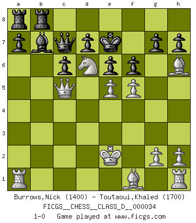Last move : 1-0 2007 May 11 17:7:42 [Event "FICGS__CHESS__CLASS_D__000034"] [Site "FICGS"] [Date "2007.03.03"] [Round "1"] [White "Burrows,Nick"] [Black "Toutaoui,Khaled"] [Result "1-0"] [WhiteElo "1400"] [BlackElo "1700"] 1.e4 c5 2.Nf3 Nc6 3.d4 cxd4 4.Nxd4 Nf6 5.Nc3 e6 6.Nxc6 bxc6 7.e5 Nd5 8.Ne4 Qc7 9.f4 Bb7 10.c4 Bb4+ 11.Ke2 Nb6 12.c5 Nd5 13.a3 Ba5 14.b4 Nxb4 15.Nd6+ Ke7 16.axb4 Bxb4 17.Qd4 Rhb8 18.f5 f6 19.Bh6 Bxc5 20.Qxc5 1-0 Sicilian defense Player White won this chess game. Follow this game move after move (download)I feel as if I were a piece in a game of Chess, when my opponent says of it: That piece cannot be moved. (Soren Kierkegaard) Je mehr ich von der FIDE weiss, um so weniger verstehe ich. (Alexander Kalifman) Alguna parte de un error es siempre correcto. (Savielly Tartakover) À la honte des hommes, on sait que les lois du jeu sont les seules qui soient partout justes, claires, inviolables et exécutées. Pourquoi l'Indien qui a donné les règles du jeu d'échecs est-il obéi de bon gré dans toute la terre, et que les décrétales des papes, par exemple, sont aujourd'hui un objet d'horreur et de mépris ? C'est que l'inventeur des échecs combina tout avec justesse pour la satisfaction des joueurs, et que les papes, dans leurs décrétales, n'eurent en vue que leur seul avantage. L'Indien voulut exercer également l'esprit des hommes et leur donner du plaisir; les papes ont voulu abrutir l'esprit des hommes. Voltaire (Dictionnaire philosophique / Garnier 1967) The modern world has divided itself into Conservatives and Progressives. The business of Progressives is to go on making mistakes. The business of the Conservatives is to prevent the mistakes from being corrected. (G.K. Chesterton)