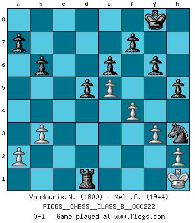 Last move : 0-1 2016 February 19 2:13:59 [Event "FICGS__CHESS__CLASS_B__000222"] [Site "FICGS"] [Date "2015.04.19"] [Round "1"] [White "Voudouris,Nick"] [Black "Meli,Cosimo Leonardo"] [Result "0-1"] [WhiteElo "1800"] [BlackElo "1944"] 1.d4 Nf6 2.f4 d5 3.e3 Bf5 4.Bd3 e6 5.Nf3 Bd6 6.O-O O-O 7.Qe2 c5 8.c3 Bxd3 9.Qxd3 Nbd7 10.Ne5 Rc8 11.b3 cxd4 12.exd4 Ne4 13.Nd2 Rxc3 14.Qe2 Ndf6 15.Nxe4 Nxe4 16.Bb2 Rc8 17.g3 Qa5 18.Nd3 Rc6 19.Rfc1 Rxc1+ 20.Nxc1 Rc8 21.Nd3 g6 22.Kg2 Rc6 23.Qd1 h5 24.Ne5 Bxe5 25.dxe5 Qb6 26.Bd4 Qc7 27.Kh1 Rc2 28.Qe1 b6 29.Qf1 Qe7 30.Qb1 Re2 31.Qf1 Rd2 32.Be3 Rc2 33.Qb1 Qc7 34.Bd4 Nf2+ 35.Kg1 Nh3+ 36.Kh1 Rd2 37.Qc1 Qxc1+ 38.Rxc1 Rxd4 39.Rd1 Rxd1+ 0-1 Canard Opening Kingside Castling by player White (move 6) Kingside Castling by player Black (move 6) Player Black won this chess game. Follow this game move after move (download)I guess a certain amount of temperament is expected of Chess geniuses. (Ron Gross) Wie gewinnt Tal? Er entwickelt alle seine Figuren in die Brettmitte und opfert sie dann irgendwo. (Robert James Fischer) En el Ajedrez, tal como es jugado por los Maestros, practicamente la suerte es eliminada. (Emanuel Lasker) Je menace de comprendre la position. (Anonyme) Perhaps chess is the wrong game for the times (The Chess Master and the Computer, by Garry Kasparov - 2010)