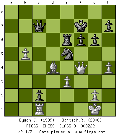 Last move : 1/2-1/2 2015 June 24 9:50:6 [Event "FICGS__CHESS__CLASS_B__000222"] [Site "FICGS"] [Date "2015.04.19"] [Round "1"] [White "Dyson,John"] [Black "Bartsch,Reinhard Andrea"] [Result "1/2-1/2"] [WhiteElo "1989"] [BlackElo "2000"] 1.d4 Nf6 2.c4 e6 3.Nc3 Bb4 4.e3 c5 5.Nge2 b6 6.a3 Bxc3+ 7.Nxc3 O-O 8.Be2 d5 9.dxc5 bxc5 10.cxd5 exd5 11.b4 c4 12.O-O Be6 13.Ra2 Qc7 14.Rd2 Nbd7 15.Bf3 Ne5 16.Bxd5 Nxd5 17.Nxd5 Bxd5 18.Rxd5 Nd3 19.Bd2 Rad8 20.Rxd8 Rxd8 21.Bc3 Nxf2 22.Qf3 Nd3 23.Qg4 g6 24.Qf3 Re8 25.Qf6 Ne5 26.a4 Re6 27.Qf4 f6 28.Bd4 c3 29.b5 c2 30.Rc1 a6 31.h4 axb5 32.axb5 Kf7 1/2-1/2 Nimzo-Indian : 4.e3 c5 Kingside Castling by player Black (move 7) Kingside Castling by player White (move 12) This chess game ended in a draw. Follow this game move after move (download)Pawns are born free, yet they are everywhere in chains. (Rick Kennedy) Obwohl ich vom Stil her kaum zu den Priestern der Schachkunst gezählt werde, halte ich Schach doch für eine Kunst. (Tigran Petrosjan) Durante una competencia de Ajedrez, un Maestro de Ajedrez deberá ser una combinación de presa de caza y un Monge. (Alexander Alekhine) J'ai vu le vaincu d'Echecs jouer des années durant dans l'espoir de la fête de la victoire. Car tu es plus riche de ce qu'elle existe si même elle n'est point pour toi. Ainsi de la perle du fond des mers. (Antoine de Saint-Exupéry) The absolute truth is the thing that makes people laugh. (Carl Reiner)