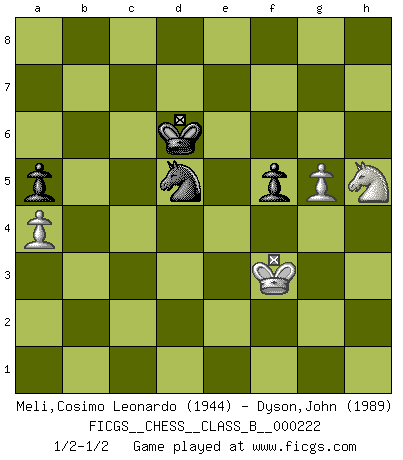 Last move : 1/2-1/2 2015 November 1 19:10:24 [Event "FICGS__CHESS__CLASS_B__000222"] [Site "FICGS"] [Date "2015.04.19"] [Round "1"] [White "Meli,Cosimo Leonardo"] [Black "Dyson,John"] [Result "1/2-1/2"] [WhiteElo "1944"] [BlackElo "1989"] 1.e4 c6 2.d4 d5 3.Nc3 dxe4 4.Nxe4 Bf5 5.Ng3 Bg6 6.Nf3 Nd7 7.Bd3 Ngf6 8.O-O e6 9.Bxg6 hxg6 10.Bf4 Qb6 11.Qe2 c5 12.Rab1 cxd4 13.Rfd1 Nd5 14.Bg5 Be7 15.c4 Bxg5 16.cxd5 Bf6 17.Ne4 Kf8 18.Nxf6 gxf6 19.dxe6 Qxe6 20.Nxd4 Qxe2 21.Nxe2 Ke7 22.Nc3 Rhd8 23.Nd5+ Kf8 24.Rbc1 f5 25.Kf1 b6 26.g3 Nc5 27.Ke2 Rd7 28.Ne3 Rad8 29.Rxd7 Rxd7 30.Rd1 Rxd1 31.Nxd1 Ke7 32.Ke3 Kd6 33.Nc3 a6 34.f3 Ke5 35.Ne2 Ne6 36.b4 Nd8 37.h4 Nc6 38.a3 Ne7 39.Nf4 Kd6 40.g4 fxg4 41.fxg4 f5 42.Kf3 Ke5 43.g5 a5 44.bxa5 bxa5 45.a4 Kd6 46.h5 gxh5 47.Nxh5 Nd5 1/2-1/2 Caro-Kann : Classical variation Kingside Castling by player White (move 8) 10 pieces endgame at move 44 : White KNPPP , Black KNPPP WHITE : King + 1 Knight 3 Pawns BLACK : King + 1 Knight 3 Pawns 9 pieces endgame at move 46 : White KNPP , Black KNPPP WHITE : King + 1 Knight 2 Pawns BLACK : King + 1 Knight 3 Pawns 8 pieces endgame at move 47 : White KNPP , Black KNPP WHITE : King + 1 Knight 2 Pawns BLACK : King + 1 Knight 2 Pawns This chess game ended in a draw. Follow this game move after move (download)All I want to do, ever, is just play Chess. (Bobby Fischer) Sehr viele beherrschen heutzutage das große Einmalseins des Schachspiels und kennen sogar dessen Logarithmentafeln auswendig - deshalb sollte man hin und wieder zu beweisen trachten, dass zwei mal zwei auch fünf sein kann. (Mikhail Nekhemyevich Tal) Un mal día en el Ajedrez, es mejor que cualquier buen día en el trabajo. (Anonymous) A ce moment-là, je menaçais de comprendre la position ! (Clément L'Heureux) In fact if nothing is done against this teddy bear, hereby I announce that I would quit chess, rapid chess, blitz chess, postal chess, email chess, server chess and correspondence chess I will then switch to a table game where teddy bears aren't going to be seen for a while, like Poker, or Roulette, all 18+ games. (Elmer Valderrama)