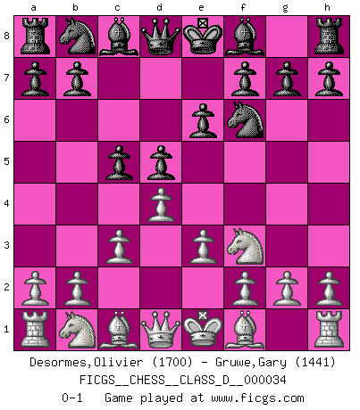 Last move : 0-1 2007 May 3 7:32:50 [Event "FICGS__CHESS__CLASS_D__000034"] [Site "FICGS"] [Date "2007.03.03"] [Round "1"] [White "Desormes,Olivier"] [Black "Gruwe,Gary"] [Result "0-1"] [WhiteElo "1700"] [BlackElo "1441"] 1.d4 Nf6 2.Nf3 e6 3.e3 c5 4.c3 d5 0-1 This chess game has been lost on time (started : 2007.03.03 17:51:14) Queen's pawn : Yusupov-Rubinstein system Player Black won this chess game. Follow this game move after move (download)First-class players lose to second-class players because second-class players sometimes play a first-class game. (Siegbert Tarrasch) Die Auseinandersetzung mit Karpow war politisch geprägt. Er stand für das kommunistische System, wurde von dessen Repräsentanten gehätschelt. Ich war der Oppositionelle. Jeder Schachweltmeister spiegelt auch die gesellschaftlichen Verhältnisse wider. Kramnik steht für die Börsen-Generation des Neuen Markts, ideologiefrei, zahlenfixiert. (Garry Kasparov) Tu cuerpo tiene que estar en óptima condición. Tu Ajedrez se deteriora como lo hace tu cuerpo. No puedes separar la mente y el cuerpo. (Bobby Fischer) Les Echecs ne sont pas pour les âmes timides. Ils requièrent un homme entier, qui ne s'arrête pas aveuglément à ce qui a été déjà établi, mais qui tente individuellement de sonder les profondeurs du jeu. (W. Steinitz) At work, the authority of a person is inversely proportional to the number of pens that person is carrying. (Dan Rotaru)
