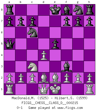 Last move : 0-1 2015 April 28 20:55:7 [Event "FICGS__CHESS__CLASS_D__000215"] [Site "FICGS"] [Date "2015.04.22"] [Round "1"] [White "MacDonald,Murdo"] [Black "Hilbert,Stephan J."] [Result "0-1"] [WhiteElo "1525"] [BlackElo "1599"] 1.e4 d5 2.exd5 Qxd5 3.Nc3 Qa5 4.Nf3 e5 5.d4 Bg4 6.Be2 Nc6 7.Bd2 Bxf3 0-1 Scandinavian (centre counter) defense Player Black won this chess game. Follow this game move after move (download)Fischer Chess play was always razor-sharp, rational and brilliant. One of the best ever. (Dave Regis) In der Schule lernt man nichts. Es ist nur Zeitverschwendung. (Robert James Fischer) En posiciones complicadas, Bobby Fischer pocas veces tuvo que temer de cualquiera. (Paul Keres) Les échecs sont utiles à l'exercice de la faculté de penser et à celle de l'imagination. Car nous devons posséder une méthode élaborée pour atteindre des buts partout où nous devons conduire notre raison. (Leibnitz) I've lost money so fast in these clubs it's left me reeling. I've read every poker book ever written, but the only way to get better at the game is to go out and play with people who are really good. The problem is, you stand to lose a lot of money doing it. (Matt Damon)