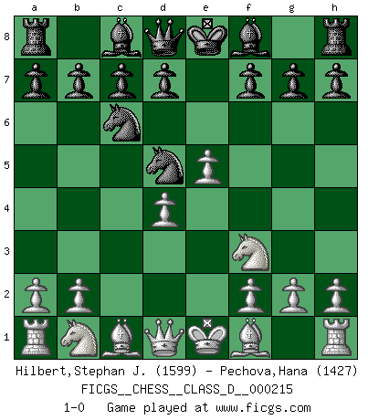 Last move : 1-0 2015 June 8 22:24:47 [Event "FICGS__CHESS__CLASS_D__000215"] [Site "FICGS"] [Date "2015.04.22"] [Round "1"] [White "Hilbert,Stephan J."] [Black "Pechova,Hana"] [Result "1-0"] [WhiteElo "1599"] [BlackElo "1427"] 1.e4 e5 2.Nf3 Nc6 3.d4 exd4 4.c3 Nf6 5.e5 Nd5 6.cxd4 1-0 Scotch : Goering gambit Player White won this chess game. Follow this game move after move (download)I am the best player in the world and I am here to prove it. (Bobby Fischer) Besser ein falscher Plan, logisch durchgeführt, als gar kein Plan. (Viktor Kortschnoi) La partida mas dura de ganar es una partida ganada. (Emanuel Lasker) Avant la finale, les dieux ont créé le milieu de partie. (Tarrasch) There is a great deal of difference between an eager man who wants to read a book and a tired man who wants a book to read. (G.K. Chesterton)