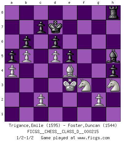 Last move : 1/2-1/2 2015 May 23 14:6:30 [Event "FICGS__CHESS__CLASS_D__000215"] [Site "FICGS"] [Date "2015.04.22"] [Round "1"] [White "Trigance,Emile"] [Black "Foster,Duncan"] [Result "1/2-1/2"] [WhiteElo "1595"] [BlackElo "1544"] 1.e4 b6 2.d4 Bb7 3.Nc3 e6 4.a3 g6 5.Nf3 h6 6.d5 Bg7 7.Bc4 e5 8.O-O d6 9.Be3 a6 10.Nd2 Ne7 11.f4 Nd7 12.f5 Nf6 13.Qf3 g5 14.h3 Qd7 15.b4 h5 16.Bxg5 O-O-O 17.a4 Ne8 18.f6 Bxf6 19.Bxf6 Nxf6 20.Qxf6 Rdf8 21.Rf3 Rhg8 22.Raf1 Kb8 23.b5 a5 24.Ne2 Bc8 25.Qh4 f5 26.exf5 Rxf5 27.Rxf5 Nxf5 28.Rxf5 Qxf5 29.Bd3 Qxh3 30.Qxh3 Bxh3 31.Be4 Bg4 32.Kf2 h4 33.Ng1 Rf8+ 34.Ke3 Kc8 35.Ndf3 Rh8 36.Nh3 Kd7 37.Nh2 Bh5 38.Nf3 Bg4 39.Nh2 Bh5 40.Nf3 1/2-1/2 Owen defense Kingside Castling by player White (move 8) Queenside Castling by player Black (move 16) This chess game ended in a draw. Follow this game move after move (download)It began to feel as though you were playing against Chess itself. - On playing against Robert Fischer. (Walter Shipman) Ich habe die Schachforschung dermaßen betrieben, dass sie auf eine wissenschaftliche Basis gestellt wurde. (Mikhail Moiseyevich Botvinik) Solo el jugador con la iniciativa tiene el derecho a atacar. (Wilhelm Steinitz) La solitude du joueur d'Echecs à l'approche du mat est semblable à celle du condamné. (Francis Szpiner) O divine art of subtlety and secrecy! Through you we learn to be invisible, through you inaudible and hence we can hold the enemy's fate in our hands. (Sun Tzu)