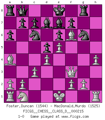 Last move : 1-0 2015 April 28 20:55:38 [Event "FICGS__CHESS__CLASS_D__000215"] [Site "FICGS"] [Date "2015.04.22"] [Round "1"] [White "Foster,Duncan"] [Black "MacDonald,Murdo"] [Result "1-0"] [WhiteElo "1544"] [BlackElo "1525"] 1.e4 e6 2.d4 d5 3.e5 Nc6 4.c3 Bd7 5.Nf3 Nge7 6.Bg5 h6 7.Bh4 g5 8.Nxg5 hxg5 9.Bxg5 Qb8 10.Bf6 Rg8 11.Qf3 Ng6 12.h4 Be7 13.Bb5 a6 14.Ba4 1-0 French : Advance variation Player White won this chess game. Follow this game move after move (download)Chess is a cold bath for the mind. (Sir John Simon) Der vorletzte Fehler gewinnt. (Savielly Grigorievitsch Tartakower) Yo creo que el Ajedrez posee una magia que es también una ayuda en la edad avanzada. Una rodilla reumática es olvidada durante una partida de Ajedrez y otros eventos pueden parecer algo sin importancia comparada a una catástrofe en el tablero de Ajedrez. (Vlastimil Hort) Le temps de noter son nom sur la feuille de partie, j'étais déjà en zeitnot ! D'un modeste amateur apparié lors de la première ronde d'un open contre le grand-maître Azmaïparashvili. Without deviation from the norm, progress is not possible. (Frank Zappa)