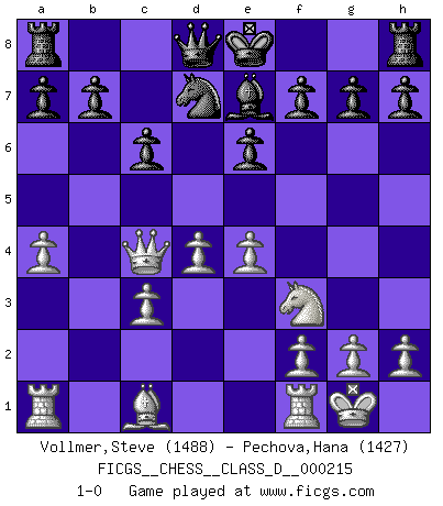 Last move : 1-0 2015 June 8 22:24:53 [Event "FICGS__CHESS__CLASS_D__000215"] [Site "FICGS"] [Date "2015.04.22"] [Round "1"] [White "Vollmer,Steve"] [Black "Pechova,Hana"] [Result "1-0"] [WhiteElo "1488"] [BlackElo "1427"] 1.d4 d5 2.c4 c6 3.e3 Bf5 4.Nf3 Nf6 5.Nc3 e6 6.Bd3 Bxd3 7.Qxd3 dxc4 8.Qxc4 Nd5 9.O-O Nd7 10.e4 Nxc3 11.bxc3 Be7 12.a4 1-0 QGD Slav defense Kingside Castling by player White (move 9) Player White won this chess game. Follow this game move after move (download)Fischer was a master of clarity and a king of artful positioning. His opponents would see where he was going but were powerless to stop him. (Bruce Pandolfini) Wenn ein Kopf und ein Buch zusammenstoßen und es klingt hohl, ist es denn allemal im Buche? (Georg Christoph Lichtenberg) El Ajedrez es tan inspirador que yo no creo que un buen jugador sea capaz de tener un pensamiento malo durante una partida. (Wilhelm Steinitz) On n'a jamais que l'âge auquel on a commence à jouer aux échecs car après on cesse de vieillir. (Capablanca) You can think I'm wrong, but that's no reason to quit thinking. (Gregory House, House M.D.)