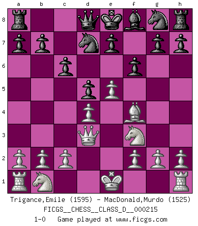 Last move : 1-0 2015 May 2 11:29:49 [Event "FICGS__CHESS__CLASS_D__000215"] [Site "FICGS"] [Date "2015.04.22"] [Round "1"] [White "Trigance,Emile"] [Black "MacDonald,Murdo"] [Result "1-0"] [WhiteElo "1595"] [BlackElo "1525"] 1.e4 c6 2.d4 d5 3.e5 Bf5 4.Bd3 Bxd3 5.Qxd3 f6 6.Nf3 Nd7 7.Bf4 1-0 Caro-Kann : Advance variation Player White won this chess game. Follow this game move after move (download)Chess is so inspiring that I do not believe a good player is capable of having an evil thought during the game. (Wilhelm Steinitz) Schach ist die gewalttätigste aller Sportarten. (Garry Kasparov) Si tu oponente te ofrece un empate, trata de averiguar porque piensa él que esta en una posición peor. (Nigel Short) Karpov est une pièce de musée. (Garry Kasparov) Fear is the path to the dark side. Fear leads to anger; anger leads to hate; hate leads to suffering. I sense much fear in you. (Master Yoda in Star Wars ep.1)