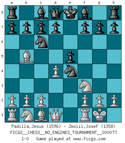 Last move : 1-0 2015 June 13 12:54:16 [Event "FICGS__CHESS__NO_ENGINES_TOURNAMENT__000077"] [Site "FICGS"] [Date "2015.04.22"] [Round "1"] [White "Padilla,Jesus"] [Black "Zmolil,Josef"] [Result "1-0"] [WhiteElo "1596"] [BlackElo "1358"] 1.e4 e5 2.Nf3 Nc6 3.Bb5 Nf6 4.O-O Nxe4 5.d4 1-0 This chess game has been lost on time (started : 2015.04.22 19:42:44) Ruy Lopez : Berlin defense, Open variation Kingside Castling by player White (move 4) Player White won this chess game. Follow this game move after move (download)Chess is the gymnasium of the mind. (Blaise Pascal) Ich habe Kasparov in Rente geschickt. (Veselin Topalov) Cuando la partida de Ajedrez termina, el Peón y el Rey regresan a la misma caja. (Irish saying) L'ordinateur a tué l'originalité. Il n'y a plus guère d'aventures sur l'échiquier. (Jacob Murray) When you stop learning you start dying. (Scott Adams)