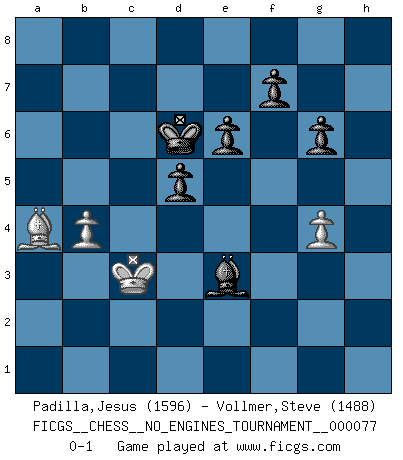 Last move : 0-1 2015 December 8 20:20:22 [Event "FICGS__CHESS__NO_ENGINES_TOURNAMENT__000077"] [Site "FICGS"] [Date "2015.04.22"] [Round "1"] [White "Padilla,Jesus"] [Black "Vollmer,Steve"] [Result "0-1"] [WhiteElo "1596"] [BlackElo "1488"] 1.e4 c5 2.Nf3 e6 3.d4 cxd4 4.Nxd4 Nc6 5.Nc3 d6 6.Be3 Be7 7.Bc4 Nf6 8.O-O O-O 9.Qd2 Nxd4 10.Bxd4 Bd7 11.Rad1 a6 12.f4 Qc7 13.Bb3 Rac8 14.Na4 Bxa4 15.Bxa4 Nxe4 16.Qe2 Nf6 17.Rde1 Qc4 18.Bxf6 Qxe2 19.Rxe2 Bxf6 20.c3 Rc5 21.Rd2 b5 22.Bb3 d5 23.a4 g6 24.axb5 axb5 25.Ra1 h5 26.Ra5 Rfc8 27.Kf2 Be7 28.g3 b4 29.cxb4 Rxa5 30.bxa5 Bb4 31.Rc2 Rxc2+ 32.Bxc2 Bxa5 33.Ke2 Kf8 34.Kd3 Ke7 35.Kd4 Kd6 36.Ba4 Bb6+ 37.Kc3 Bg1 38.h3 Bh2 39.g4 Bxf4 40.b4 hxg4 41.hxg4 Be3 0-1 This chess game has been lost on time (started : 2015.04.22 19:42:44) Sicilian : Taimanov variation Kingside Castling by player White (move 8) Kingside Castling by player Black (move 8) 10 pieces endgame at move 41 : White KBPP , Black KBPPPP WHITE : King + 1 Bishop 2 Pawns BLACK : King + 1 Bishop 4 Pawns Player Black won this chess game. Follow this game move after move (download)There is no remorse like the remorse of Chess. (H. G. Wells) Spielt Blackmar-Diemer-Gambit, und das Matt kommt von selbst! (Emil Joseph Diemer) Cualquier cambio de material en una posición debe venir por medio de un mate, una captura o promoción de Peón. (Purdy) À la honte des hommes, on sait que les lois du jeu sont les seules qui soient partout justes, claires, inviolables et exécutées. Pourquoi l'Indien qui a donné les règles du jeu d'échecs est-il obéi de bon gré dans toute la terre, et que les décrétales des papes, par exemple, sont aujourd'hui un objet d'horreur et de mépris ? C'est que l'inventeur des échecs combina tout avec justesse pour la satisfaction des joueurs, et que les papes, dans leurs décrétales, n'eurent en vue que leur seul avantage. L'Indien voulut exercer également l'esprit des hommes et leur donner du plaisir; les papes ont voulu abrutir l'esprit des hommes. Voltaire (Dictionnaire philosophique / Garnier 1967) Tree pose grows confidence. It roots me to this world. (Terri Guillemets)