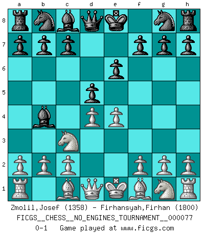 Last move : 0-1 2015 June 14 1:7:22 [Event "FICGS__CHESS__NO_ENGINES_TOURNAMENT__000077"] [Site "FICGS"] [Date "2015.04.22"] [Round "1"] [White "Zmolil,Josef"] [Black "Firhansyah,Firhan"] [Result "0-1"] [WhiteElo "1358"] [BlackElo "1800"] 1.d4 e6 2.e4 d5 3.Nc3 Bb4 0-1 This chess game has been lost on time (started : 2015.04.22 19:42:44) Queen's pawn Player Black won this chess game. Follow this game move after move (download)During a Chess competition a Chessmaster should be a combination of a beast of prey and a monk. (Alexander Alekhine) Ich bin Weltmeister und muß mit niemandem irgend etwas diskutieren. (Viswanathan Anand) Te sientas frente a un tablero y repentinamente tu corazón brinca. Tu mano tiembla al tomar una pieza y moverla. Pero lo que el Ajedrez te enseña es que tu debes permanecer ahí con calma y pensar de que si realmente es una buena idea o de que si hay otras ideas mejores. (Stanley Kubrick) Ce n'est pas pour s'amuser qu'il joue aux échecs : il célèbre un culte. (Vladimir Nabokov) How many people work in NATO Headquarters ? - About half of them. (Dirk Stikker, NATO general secretary)