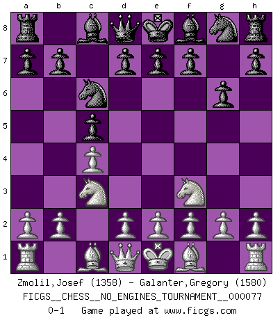 Last move : 0-1 2015 June 16 13:23:46 [Event "FICGS__CHESS__NO_ENGINES_TOURNAMENT__000077"] [Site "FICGS"] [Date "2015.04.22"] [Round "1"] [White "Zmolil,Josef"] [Black "Galanter,Gregory"] [Result "0-1"] [WhiteElo "1358"] [BlackElo "1580"] 1.c4 c5 2.Nc3 Nc6 3.Nf3 g6 0-1 This chess game has been lost on time (started : 2015.04.22 19:42:44) English : Symmetrical variation Player Black won this chess game. Follow this game move after move (download)Only sissies Castle. (Rob Sillars) Du weisst es gibt ein Problem mit Computern und Fernschach, wenn jeder eine Rating von 2450 hat. (John Christen Knudsen) Aquel que teme a un Peón de Reina aislado, debería de retirarse del Ajedrez. (Siegbert Tarrasch) Si le désir cupide (et stupide) de gagner est une inépuisable source de souffrance, une combinaison brillante sur l'échiquier est une découverte : le coquelicot qui s'épanouit lorsque apparaît la Voie Lactée. (Arrabal) Always be a first-rate version of yourself, instead of a second-rate version of somebody else. (Judy Garland)