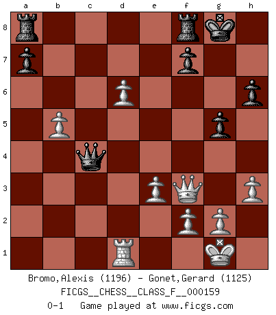Last move : 0-1 2015 May 5 21:28:19 [Event "FICGS__CHESS__CLASS_F__000159"] [Site "FICGS"] [Date "2015.04.27"] [Round "1"] [White "Bromo,Alexis"] [Black "Gonet,Gerard"] [Result "0-1"] [WhiteElo "1196"] [BlackElo "1125"] 1.d4 Nf6 2.c4 g6 3.Nc3 Bg7 4.e3 O-O 5.Nf3 d6 6.h3 Nc6 7.a3 e5 8.d5 Ne7 9.Be2 Bd7 10.b4 c5 11.b5 e4 12.Ng5 h6 13.Ngxe4 Nxe4 14.Nxe4 Bxa1 15.Nxd6 Bc3+ 16.Bd2 Qa5 17.Bxc3 Qxc3+ 18.Qd2 Qa1+ 19.Bd1 Qxa3 20.Nxb7 g5 21.O-O Ng6 22.Bf3 Ne5 23.Qe2 Qb3 24.Nxc5 Qb4 25.Nxd7 Nxd7 26.Rd1 Ne5 27.d6 Nxf3+ 28.Qxf3 Qxc4 0-1 King's Indian defense, 3.Nc3 Kingside Castling by player Black (move 4) Kingside Castling by player White (move 21) Player Black won this chess game. Follow this game move after move (download)A bad plan is better than none at all. (Frank Marshall) Gegen einen Schachcomputer zu verlieren ist wie Löcher in den Strümpfen zuhaben. Es ist nicht peinlich, solange man der einzige ist der es weiß. (Anonymous) Aquel que teme a un Peón de Reina aislado, debería de retirarse del Ajedrez. (Siegbert Tarrasch) Vouloir jouer aux échecs contre soi-même est aussi paradoxal que vouloir marcher sur son ombre. (Stefan Zweig) A government big enough to give you everything you want is strong enough to take everything you have. (Thomas Jefferson)