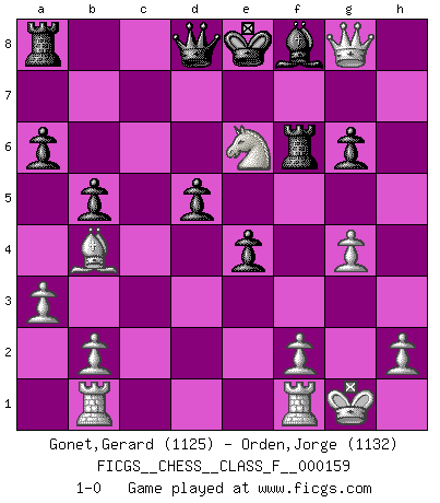 Last move : 1-0 2015 May 28 22:55:54 [Event "FICGS__CHESS__CLASS_F__000159"] [Site "FICGS"] [Date "2015.04.27"] [Round "1"] [White "Gonet,Gerard"] [Black "Orden,Jorge"] [Result "1-0"] [WhiteElo "1125"] [BlackElo "1132"] 1.d4 d5 2.e4 c6 3.c4 g6 4.Nc3 Bg7 5.e5 a6 6.Nf3 e6 7.cxd5 cxd5 8.Be2 Ne7 9.O-O O-O 10.Qd3 b5 11.a3 Nbc6 12.Ng5 Na5 13.Qh3 h6 14.Nf3 Nf5 15.g4 Nb3 16.Rb1 Nfxd4 17.Bxh6 Nxe2+ 18.Nxe2 f6 19.Nfd4 Nd2 20.Bxd2 fxe5 21.Nf3 e4 22.Ng5 Rf3 23.Qh7+ Kf8 24.Nd4 Rf6 25.Bb4+ Ke8 26.Qg8+ Bf8 27.Ndxe6 Bxe6 28.Nxe6 1-0 Blackmar gambit Kingside Castling by player White (move 9) Kingside Castling by player Black (move 9) Player White won this chess game. Follow this game move after move (download)After black's reply to 1.e4 with 1..e5, leaves him always trying to get into the game. (Howard Staunton) Habe Mut, dich deines eigenen Verstandes zu bedienen. (Immanuel Kant) Buenas posiciones no logran ganar juegos, buenas movidas sí. (Gerald Abrahams) Les échecs, c'est l'imagination. (David Bronstein) If we knew what we were doing, we would not call it research. (Albert Einstein)