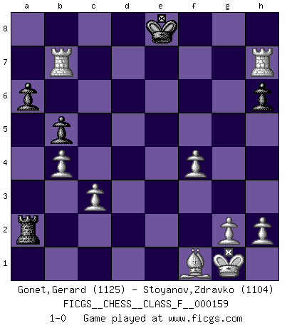 Last move : 1-0 2015 May 12 20:39:23 [Event "FICGS__CHESS__CLASS_F__000159"] [Site "FICGS"] [Date "2015.04.27"] [Round "1"] [White "Gonet,Gerard"] [Black "Stoyanov,Zdravko"] [Result "1-0"] [WhiteElo "1125"] [BlackElo "1104"] 1.d4 d5 2.e4 dxe4 3.Nc3 e6 4.Nxe4 h6 5.Nf3 b6 6.Be2 Nc6 7.O-O Bb7 8.Be3 Bd6 9.Bb5 Nge7 10.d5 exd5 11.Nxd6+ Qxd6 12.Qd2 O-O 13.Bf4 Qf6 14.c3 a6 15.Bxc7 Na5 16.Rfe1 Rfc8 17.Be5 Qg6 18.Bd3 Qc6 19.Bxg7 Kxg7 20.Rxe7 Qf6 21.Rae1 Rd8 22.b4 Nc6 23.Rxb7 b5 24.Bf1 Ne7 25.R1xe7 Rf8 26.Qxd5 Rad8 27.Qe5 Qxe5 28.Nxe5 Kf6 29.f4 Rd2 30.Rec7 Rxa2 31.Nd7+ Ke7 32.Nxf8 Kxf8 33.Rxf7+ Ke8 34.Rh7 1-0 Blackmar gambit Kingside Castling by player White (move 7) Kingside Castling by player Black (move 12) Player White won this chess game. Follow this game move after move (download)The laws of Chess do not permit a free choice: you have to move whether you like it or not. (Emanuel Lasker) Jede Eröffnung ist gut genug um gespielt zu werden, wenn nur ihr Ruf schlecht genug ist. (Savielly Grigorievitsch Tartakower) Del Ajedrez se ha dicho que la vida no es lo suficientemente larga para él, pero eso es culpa de la vida, no del Ajedrez. (William Ewart Napier) Les Echecs ne sont pas pour les âmes timides. Ils requièrent un homme entier, qui ne s'arrête pas aveuglément à ce qui a été déjà établi, mais qui tente individuellement de sonder les profondeurs du jeu. (W. Steinitz) The smarter you play, the luckier you'll be. (Mark Pilarski)