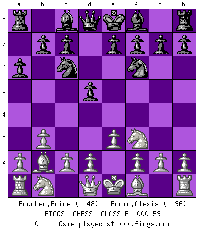 Last move : 0-1 2015 June 10 12:38:10 [Event "FICGS__CHESS__CLASS_F__000159"] [Site "FICGS"] [Date "2015.04.27"] [Round "1"] [White "Boucher,Brice"] [Black "Bromo,Alexis"] [Result "0-1"] [WhiteElo "1148"] [BlackElo "1196"] 1.Nf3 d5 2.b3 Nc6 3.Bb2 Nf6 4.e3 a6 0-1 This chess game has been lost on time (started : 2015.04.27 22:0:19) Reti : Nimzovich-Larsen attack Player Black won this chess game. Follow this game move after move (download)I know people who have all the will in the world, but still can't play good Chess. (Bobby Fischer) Er war ein guter Schachspieler, aber ich kann Leute nicht ausstehen, die 'Heil Hitler' rufen (Über Alexander Aljechin). (Miguel Najdorf) Cuando veas una buena jugada, trata de encontrar otra mejor. (Emanuel Lasker) Votre prénom est 'Tactique', votre deuxième prénom est 'Tactique' et votre nom est 'Tactique'. (Ken Smith) We're missing something. (Gregory House, House M.D.)