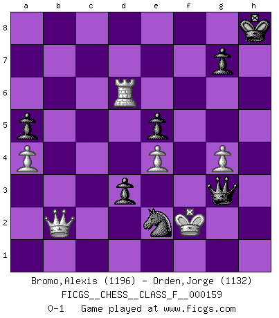 Last move : 0-1 2015 July 3 22:21:45 [Event "FICGS__CHESS__CLASS_F__000159"] [Site "FICGS"] [Date "2015.04.27"] [Round "1"] [White "Bromo,Alexis"] [Black "Orden,Jorge"] [Result "0-1"] [WhiteElo "1196"] [BlackElo "1132"] 1.d4 d5 2.c4 e6 3.a3 Nf6 4.Nc3 Be7 5.h3 O-O 6.Nf3 a6 7.c5 b6 8.b4 c6 9.Bf4 bxc5 10.bxc5 a5 11.Rb1 Ba6 12.e3 Bxf1 13.Rxf1 Nbd7 14.Ne5 Qc8 15.f3 Ne8 16.Kf2 f6 17.Nxd7 Qxd7 18.e4 e5 19.dxe5 Bxc5+ 20.Kg3 fxe5 21.Bc1 d4 22.Na4 Bd6 23.Nb6 Qb7 24.Qb3+ Kh8 25.Nxa8 Qxa8 26.a4 Nf6 27.Ba3 Rb8 28.Qd3 Rd8 29.Bxd6 Rxd6 30.Rfc1 Nh5+ 31.Kh2 Nf4 32.Qa3 Rg6 33.g4 h5 34.Rc5 hxg4 35.fxg4 Re6 36.Rb6 Qd8 37.Rbxc6 Rxc6 38.Rxc6 d3 39.Rd6 Qh4 40.Qb2 Qxh3+ 41.Kg1 Ne2+ 42.Kf2 Qg3+ 0-1 Queen's gambit declined Kingside Castling by player Black (move 5) Player Black won this chess game. Follow this game move after move (download)A passed Pawn increases in strength as the number of pieces on the board diminishes. (Capablanca) Kasparov ist eine Art Monster mit hundert Augen, denen auch nicht das Geringste entgeht. (Tony Miles) La señal de un Gran Maestro es su habilidad de ganar una partida rápidamente y sin dolor. (Irving Chernev) Aidez vos pièces, elles vous aideront. (Paul Morphy) There are three kinds of lies: lies, damned lies and statistics. (Mark Twain)