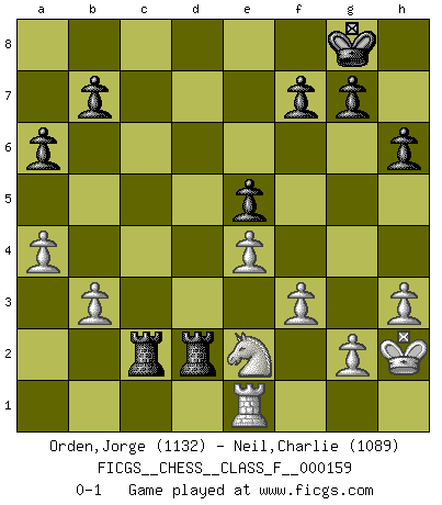 Last move : 0-1 2015 June 8 23:25:7 [Event "FICGS__CHESS__CLASS_F__000159"] [Site "FICGS"] [Date "2015.04.27"] [Round "1"] [White "Orden,Jorge"] [Black "Neil,Charlie"] [Result "0-1"] [WhiteElo "1132"] [BlackElo "1089"] 1.e4 c5 2.Nf3 d6 3.d4 cxd4 4.Nxd4 Nf6 5.Bb5+ Bd7 6.Bxd7+ Nbxd7 7.Nc3 a6 8.O-O e6 9.Re1 Be7 10.Be3 O-O 11.h3 e5 12.Nf5 Re8 13.Nxd6 Bxd6 14.Qxd6 Re6 15.Qd2 Nb6 16.Qxd8+ Rxd8 17.Bxb6 Rxb6 18.b3 Rd2 19.Rac1 h6 20.f3 Rbd6 21.Re2 Nh5 22.Kh2 Nf4 23.Rce1 Nxe2 24.Nxe2 Rxc2 25.a4 R6d2 0-1 Sicilian Kingside Castling by player White (move 8) Kingside Castling by player Black (move 10) Player Black won this chess game. Follow this game move after move (download)I won't play with you anymore. You have insulted my friend. - When an opponent cursed himself for a blunder. (Miguel Najdorf) Es tut gut, die Entwicklungsperiode von, [...] demokratischem Geist durchdringen zu lassen. Wie undemokratisch wäre es doch beispielsweise, den einen Offizier große Spaziertouren vornehmen zu lassen, während die anderen zu Hause säßen und sich entsetzlich langweilten. (Aaron Nimzowitsch) Si el Ajedrez es una ciencia, es la mas inexacta. Si el Ajedrez es un arte, es demasiado inexacto para ser visto como tal. Si el Ajedrez es un deporte, es demasiado esotérico. Si el Ajedrez es un juego, es demasiado exigente para ser solo un juego. Si el Ajedrez es una aventura, es una muy demandante. Si el Ajedrez es una pasión, es una muy gratificante. Si el Ajedrez es la vida, es una muy triste. (Anónimo) Vous m'avez demandé de vous exposer quel est le fondement de la prière. Je ne fais que préparer les pièces du jeu sur la table... Nous sera-t-il permis d'en adopter les règles et si nous les appliquons scrupuleusement nous ne tarderons pas à faire mat le Roi divin ! Il ne pourra échapper à nos mains. (Sainte Thérèse d'Avila, Chemin de perfection) Begin at the beginning and go on till you come to the end; then stop. (Lewis Carrol, Alice in Wonderland)